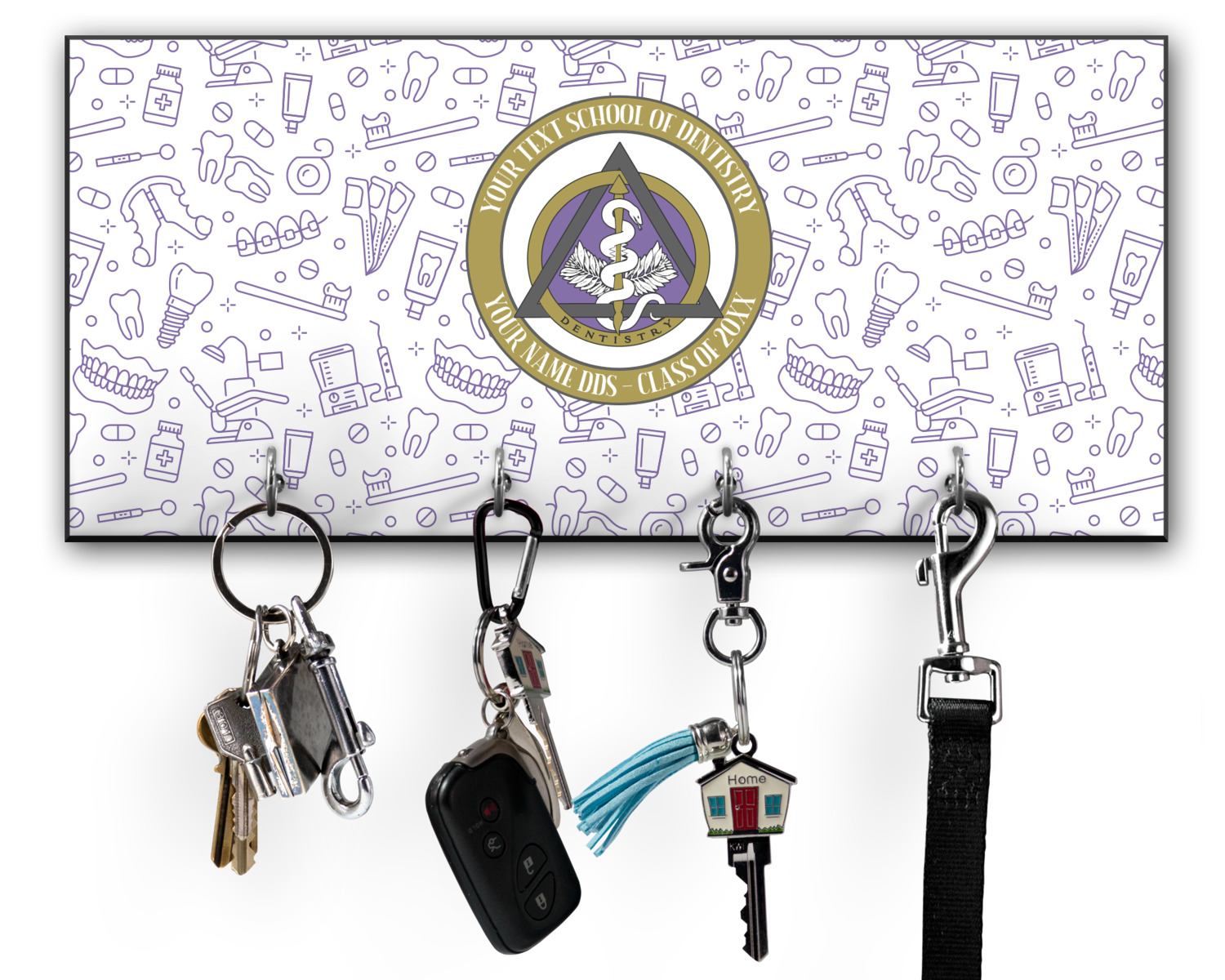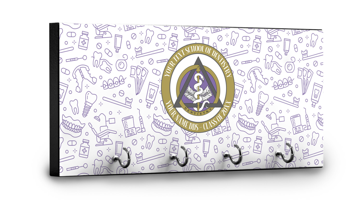 This design features the dental insignia (aka emblem, symbol, logo) at the center with personalization in a circle around the emblem.You can customize the name of the dental school, as well as the name of the dentist and the year they graduated.