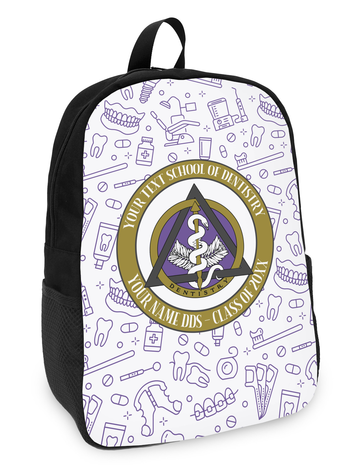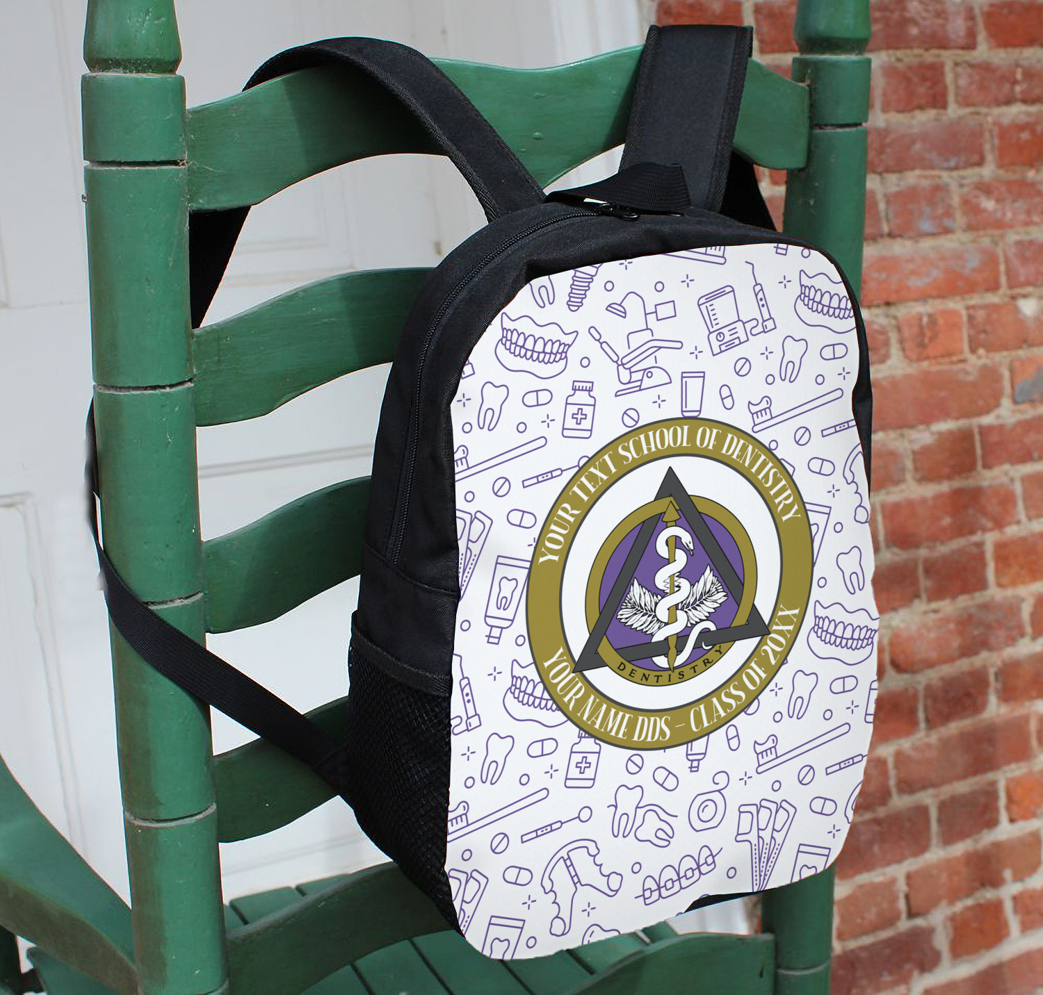 This design features the dental insignia (aka emblem, symbol, logo) at the center with personalization in a circle around the emblem.You can customize the name of the dental school, as well as the name of the dentist and the year they graduated.