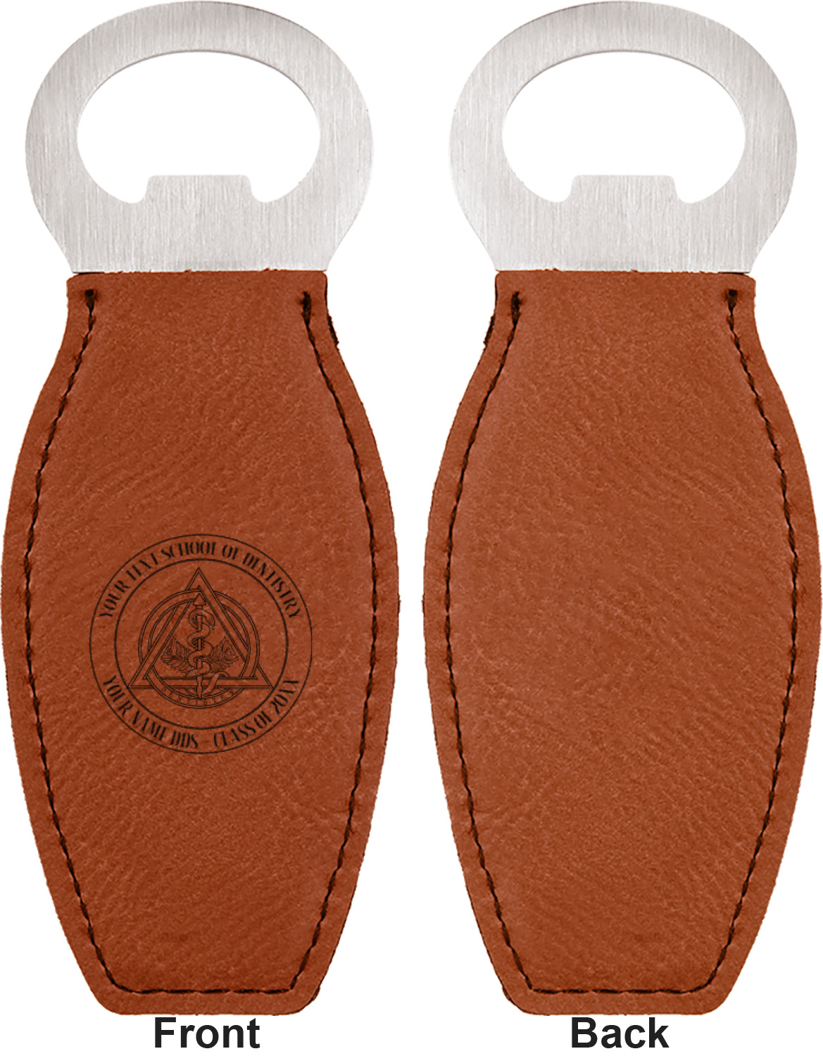 Built from stainless steel, these custom bottle openers are wrapped in a cognac-colored leatherette. Sharp, black stitching lines the edges for extra durability and a finished touch. Your personalization is laser-engraved onto the surface of this leatherette, leaving behind a crisp, black coloration. At 4.6 by 1.8 inches, this beer bottle opener gives you much of leverage when trying to open a stubborn bottle. On the opposite end of the opener, you'll find a magnet that you can use to display your new, unique bottle opener!