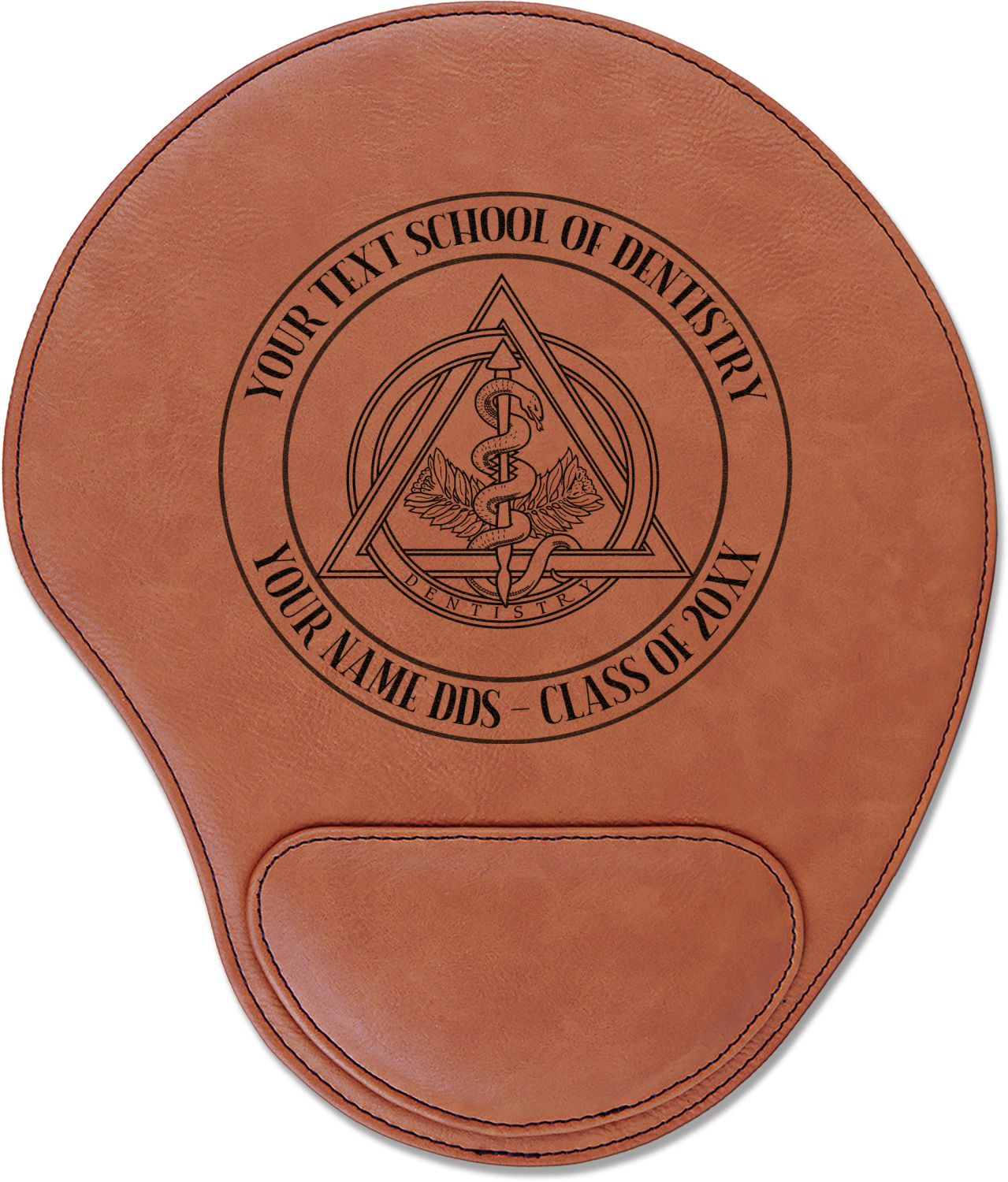 In a rounded shape, this mouse pad is made of a luxurious, cognac-colored leatherette. The nature of this material allows your mouse to glide smoothly across its surface. Strong stitching lines the edges to guarantee stability and strength. As added support for tired wrists, your personalized mouse pad features a supportive wrist rest at its bottom. This model measures at 10.25" x 9", while its wrist pad is approximately 5" x 2.75", with a thickness of 0.75". Your personalized design is laser engraved into the front face of this mouse pad.