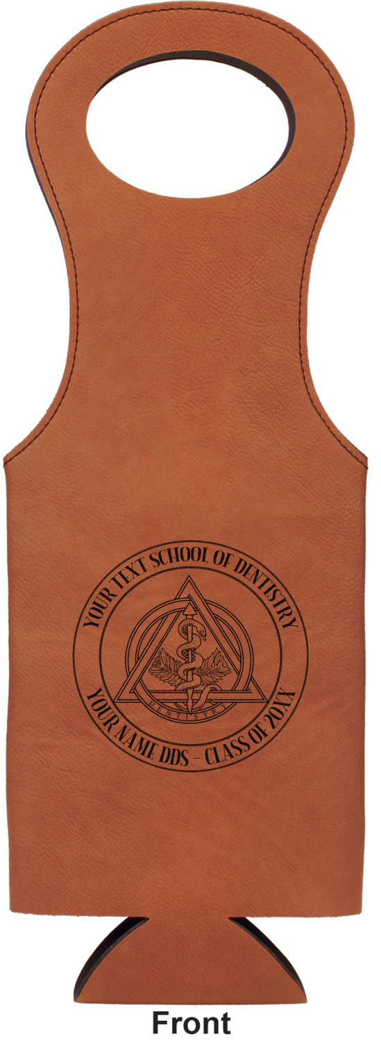 This wine carrier is made from a stunning leatherette, in a cognac-brown color. Strong, black stitching lines the sides of your wine bottle bag and provides extra durability. The interior is lined with a padded, black material to allow for a snug fit once your bottle is placed inside. At the top of this wine gift bag, you'll find two oval shaped handles that elegantly complements the rest of the bag's style. We provide you with the option of laser-engraving the front, or the front and back of your new personalized wine bag!