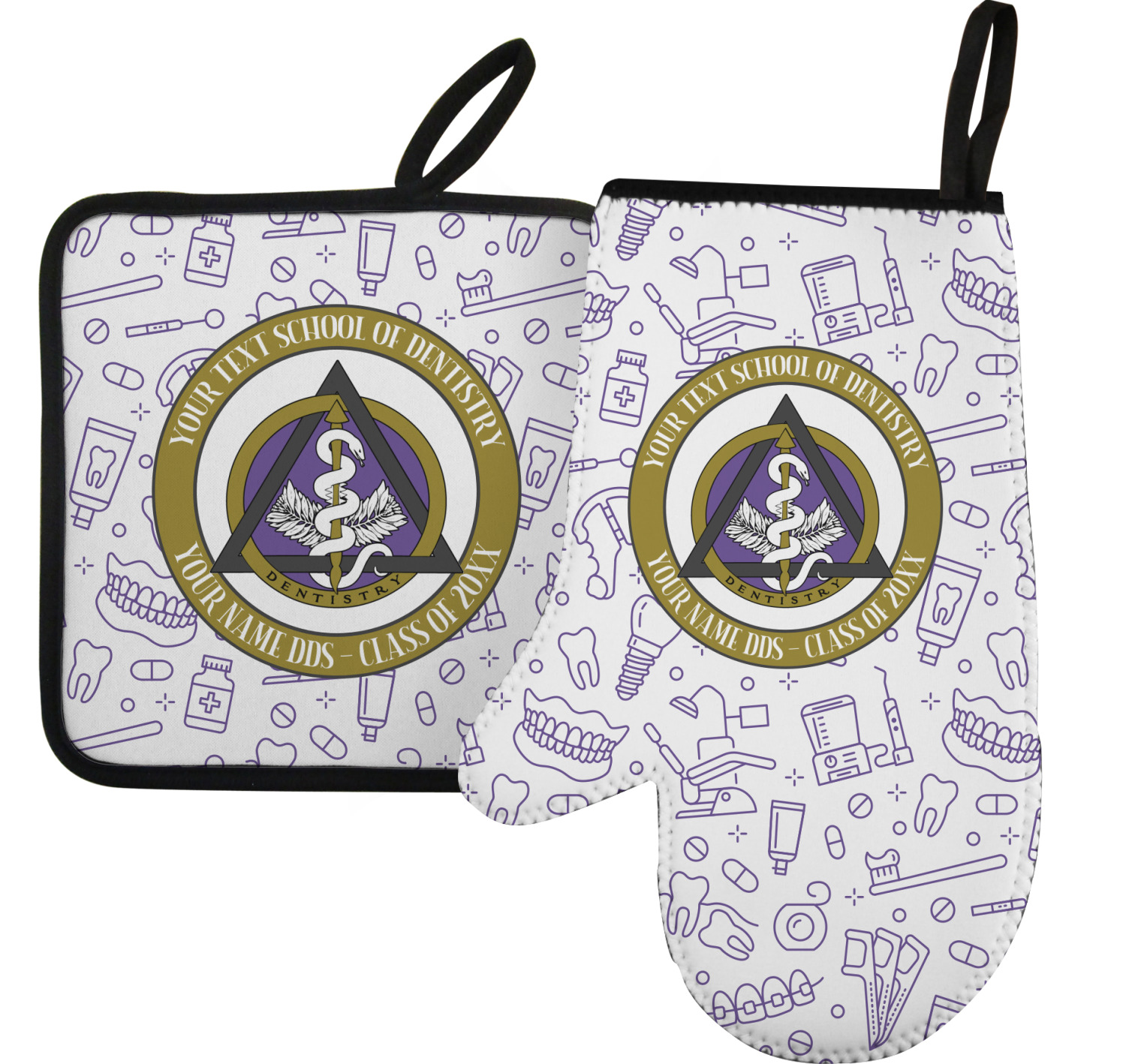 This design features the dental insignia (aka emblem, symbol, logo) at the center with personalization in a circle around the emblem.You can customize the name of the dental school, as well as the name of the dentist and the year they graduated.