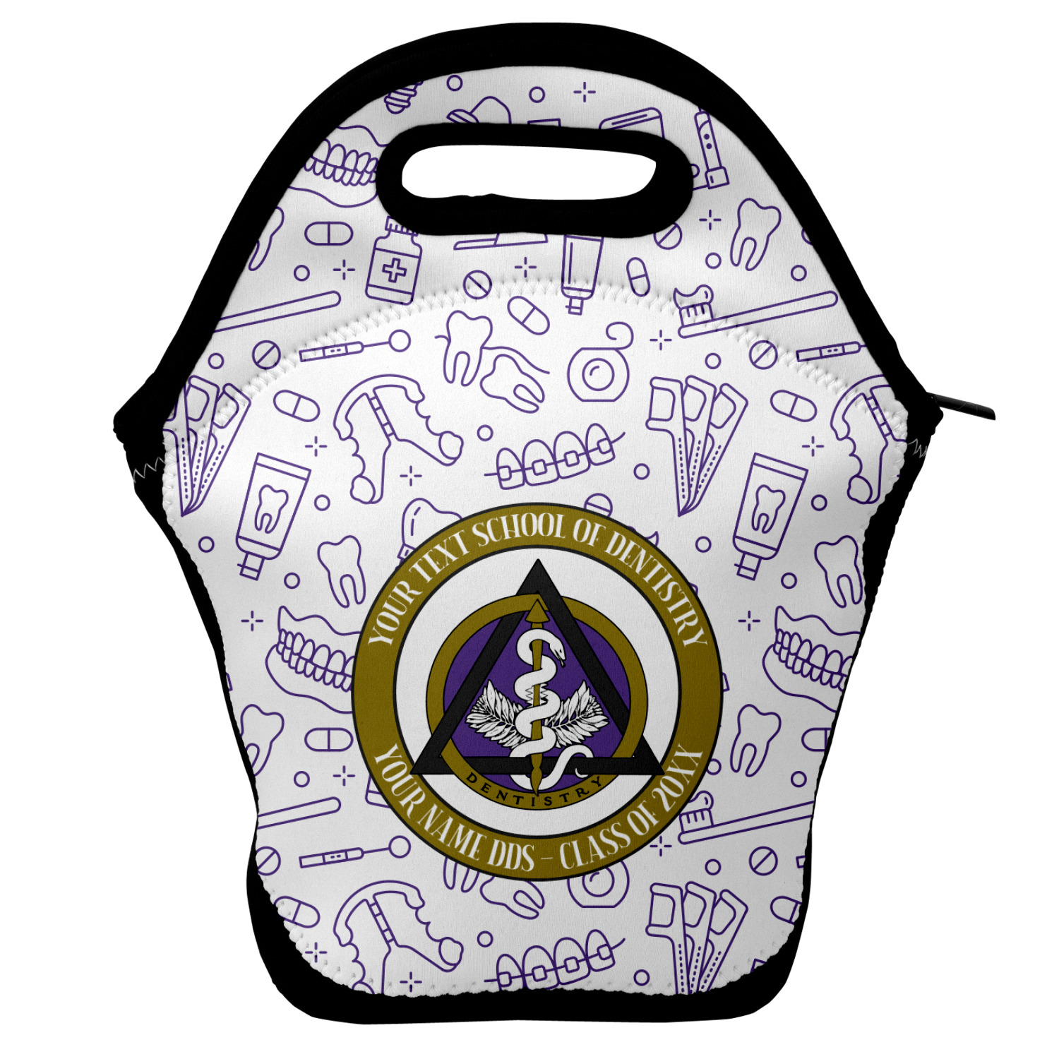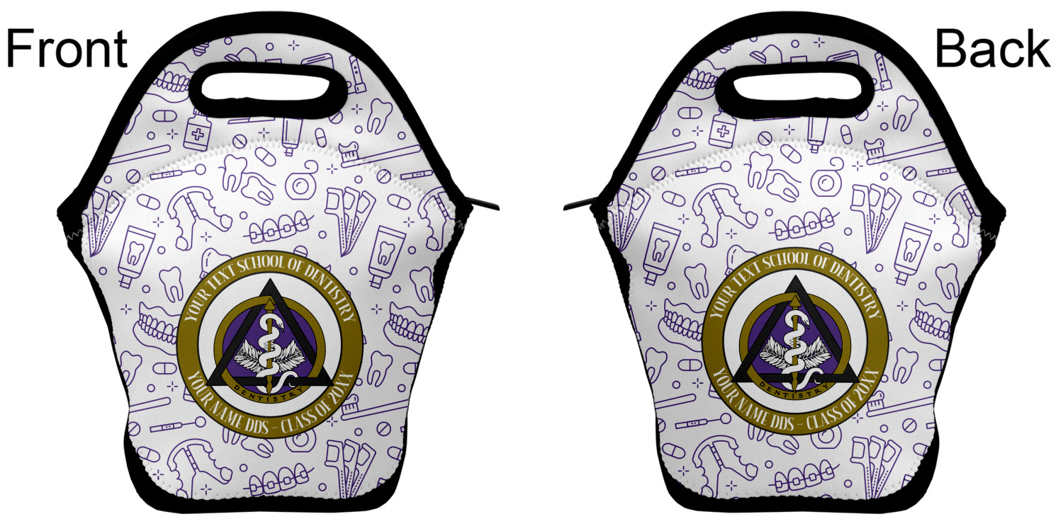 Our personalized lunch bags are made from a strong neoprene, and secure with a zipper closure that lines the top of the bag.The edges of the neoprene are sewn together with a heavy duty stitch, adding to the durability of the bag. The is accompanied by a reinforced handle at its top, for the easy transport of your lunch. We display your personalization across both the front and back of this neoprene lunch bag, while the remaining sides are a sleek black in color. Each bag measures at 13.5 inches tall, and 11.5 inches wide.