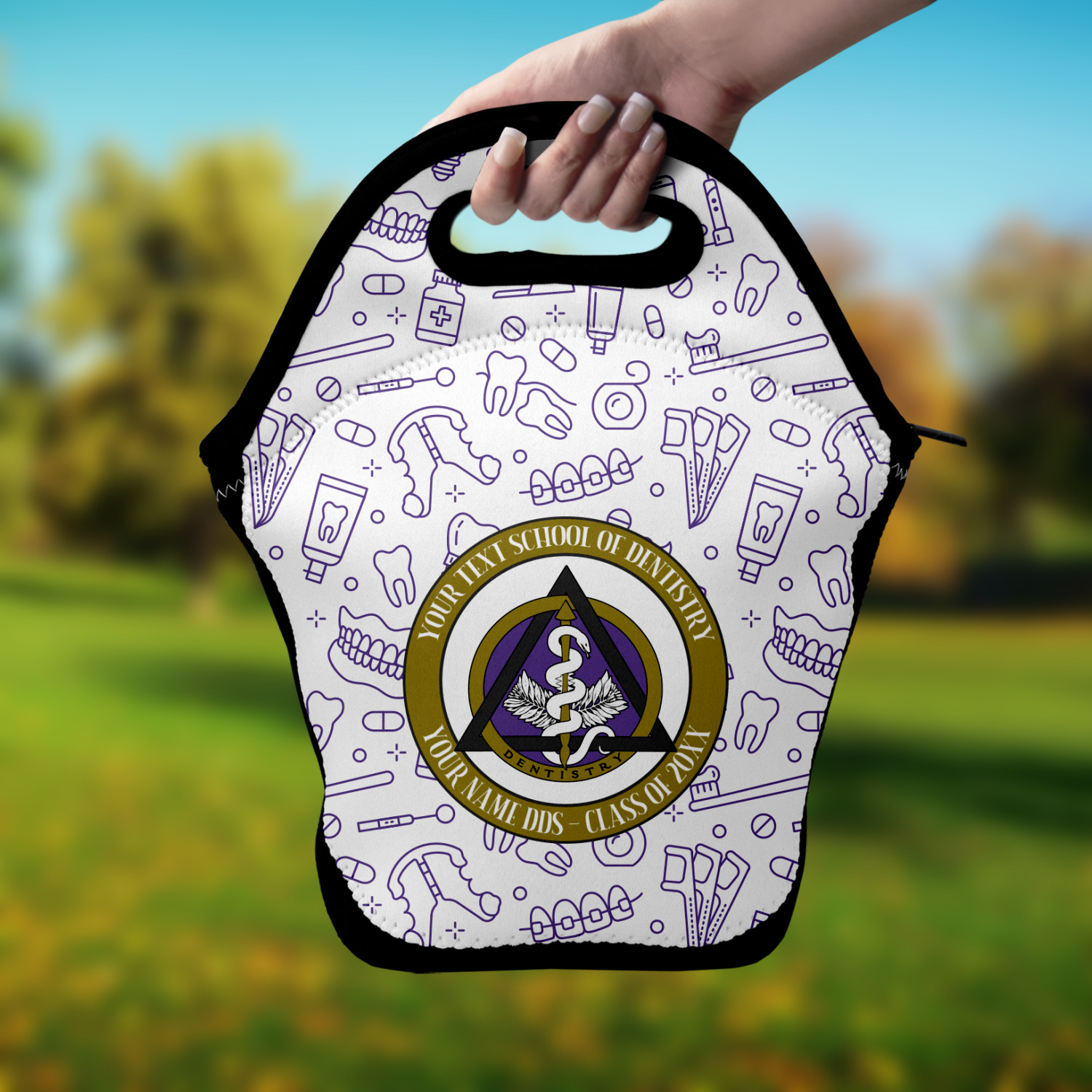 This design features the dental insignia (aka emblem, symbol, logo) at the center with personalization in a circle around the emblem.You can customize the name of the dental school, as well as the name of the dentist and the year they graduated.