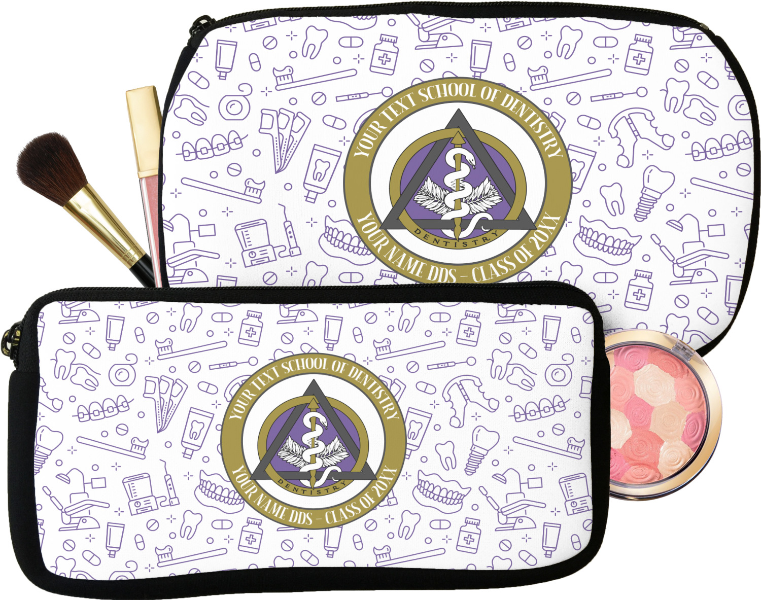 This design features the dental insignia (aka emblem, symbol, logo) at the center with personalization in a circle around the emblem.You can customize the name of the dental school, as well as the name of the dentist and the year they graduated.