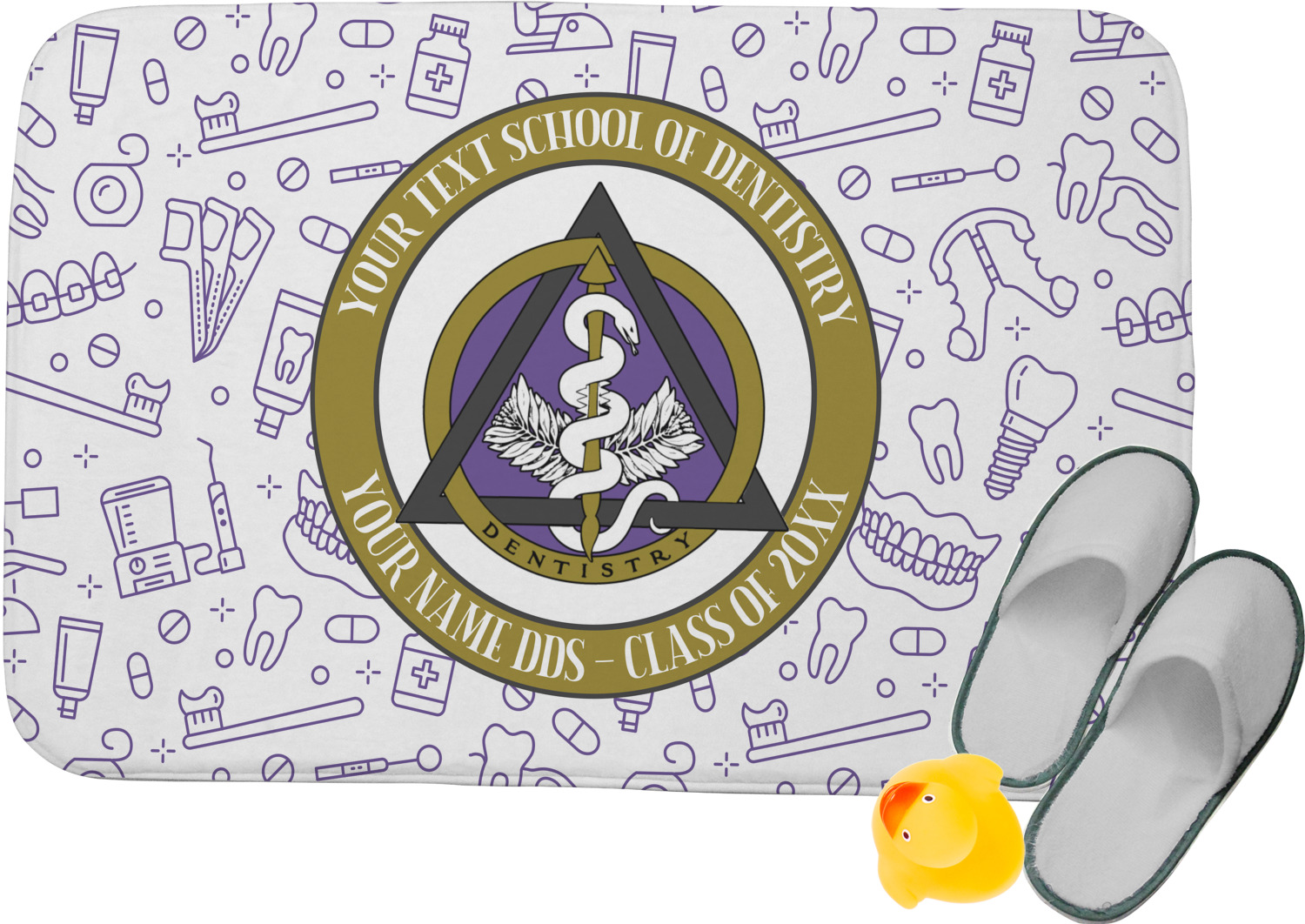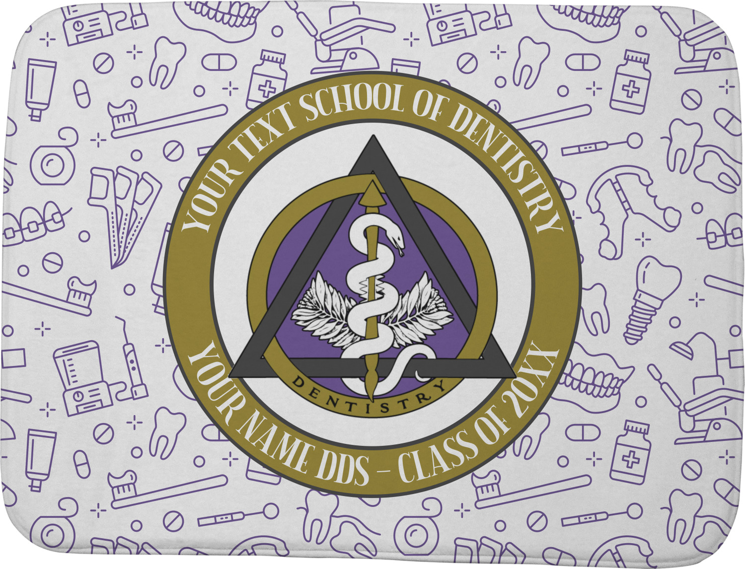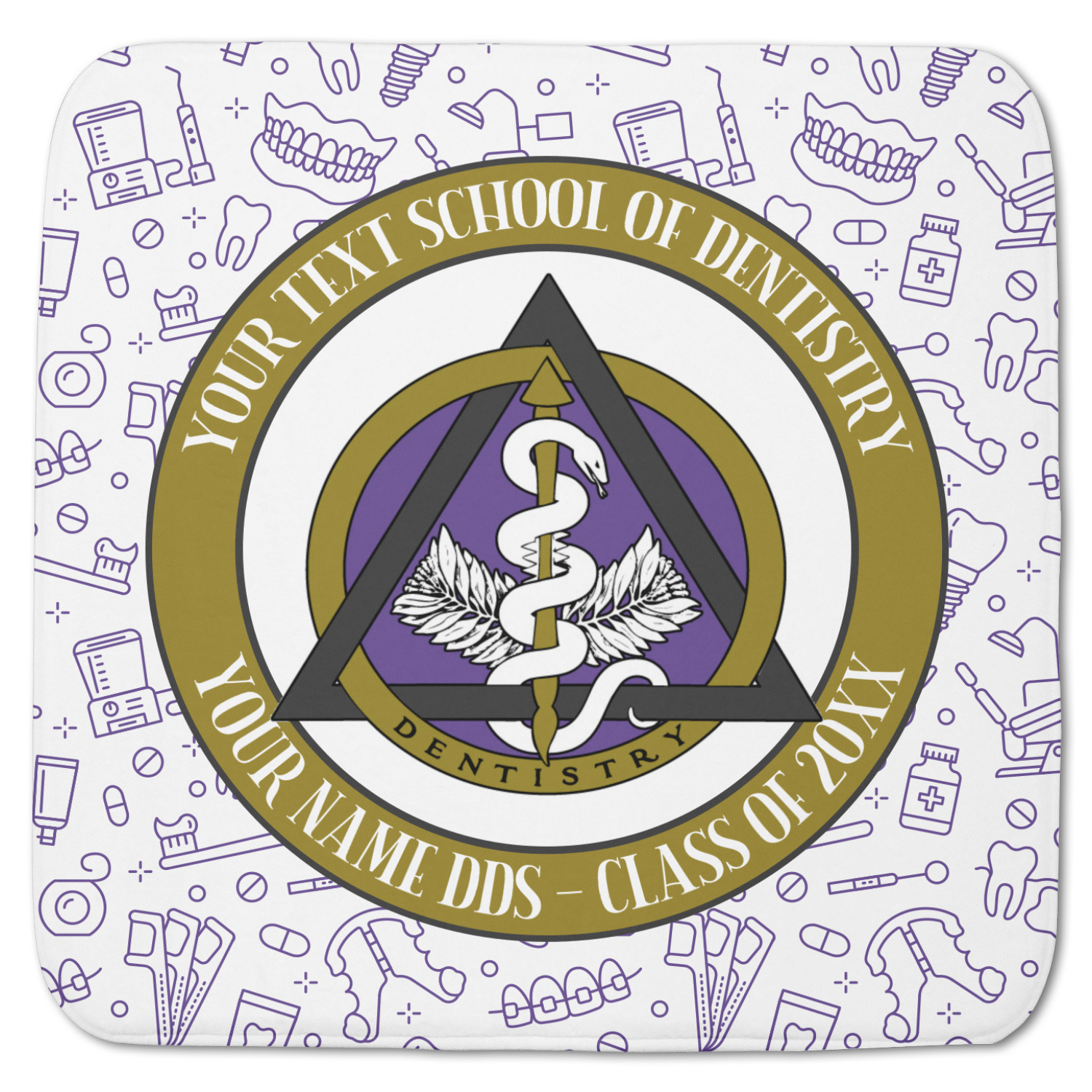 This design features the dental insignia (aka emblem, symbol, logo) at the center with personalization in a circle around the emblem.You can customize the name of the dental school, as well as the name of the dentist and the year they graduated.