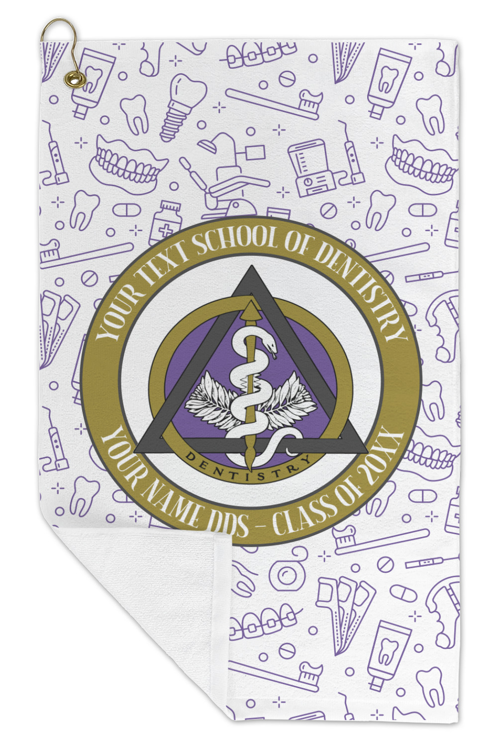 This design features the dental insignia (aka emblem, symbol, logo) at the center with personalization in a circle around the emblem.You can customize the name of the dental school, as well as the name of the dentist and the year they graduated.