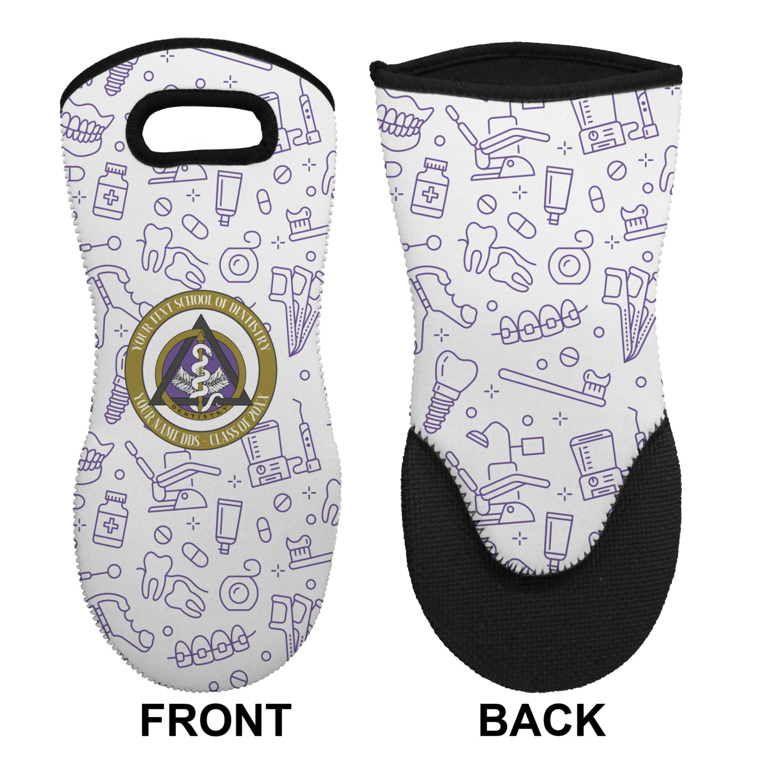 This design features the dental insignia (aka emblem, symbol, logo) at the center with personalization in a circle around the emblem.You can customize the name of the dental school, as well as the name of the dentist and the year they graduated.