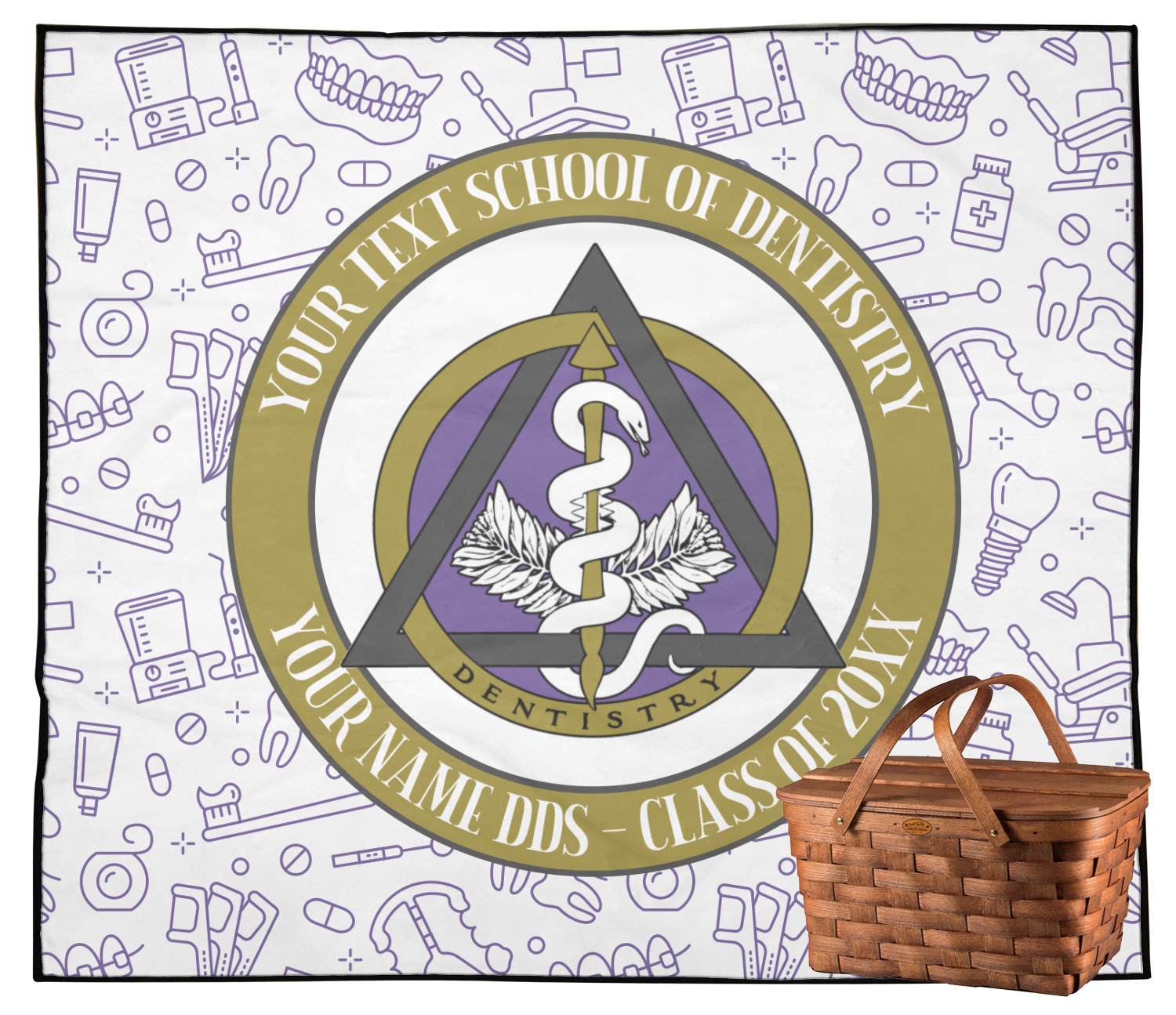 This design features the dental insignia (aka emblem, symbol, logo) at the center with personalization in a circle around the emblem.You can customize the name of the dental school, as well as the name of the dentist and the year they graduated.