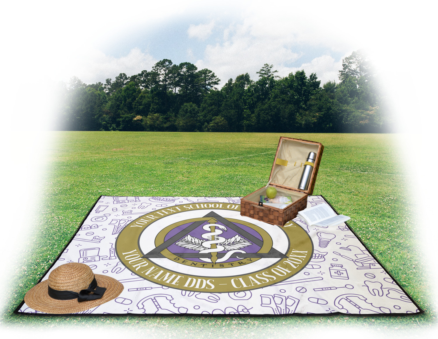 This picnic blanket is perfect for hanging out with your friends at the park or anywhere outside. The top of the blanket is made of a super soft microfiber fleece. The bottom of the blanket is made of a black material similar to a rain jacket and is water repellent as well. This will keep any wet spots on the ground from soaking through your picnic blanket. No one likes a wet blanket. The blanket measures at approximately 50" x 59" and has a nicely finished ribbon edge.