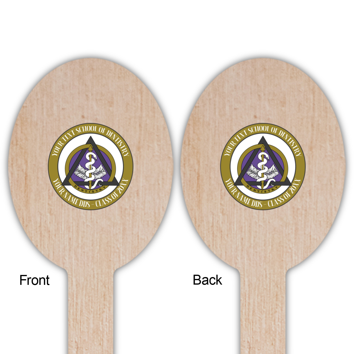 This design features the dental insignia (aka emblem, symbol, logo) at the center with personalization in a circle around the emblem.You can customize the name of the dental school, as well as the name of the dentist and the year they graduated.