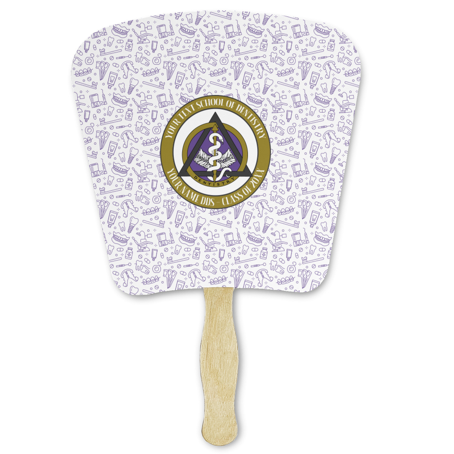This design features the dental insignia (aka emblem, symbol, logo) at the center with personalization in a circle around the emblem.You can customize the name of the dental school, as well as the name of the dentist and the year they graduated.