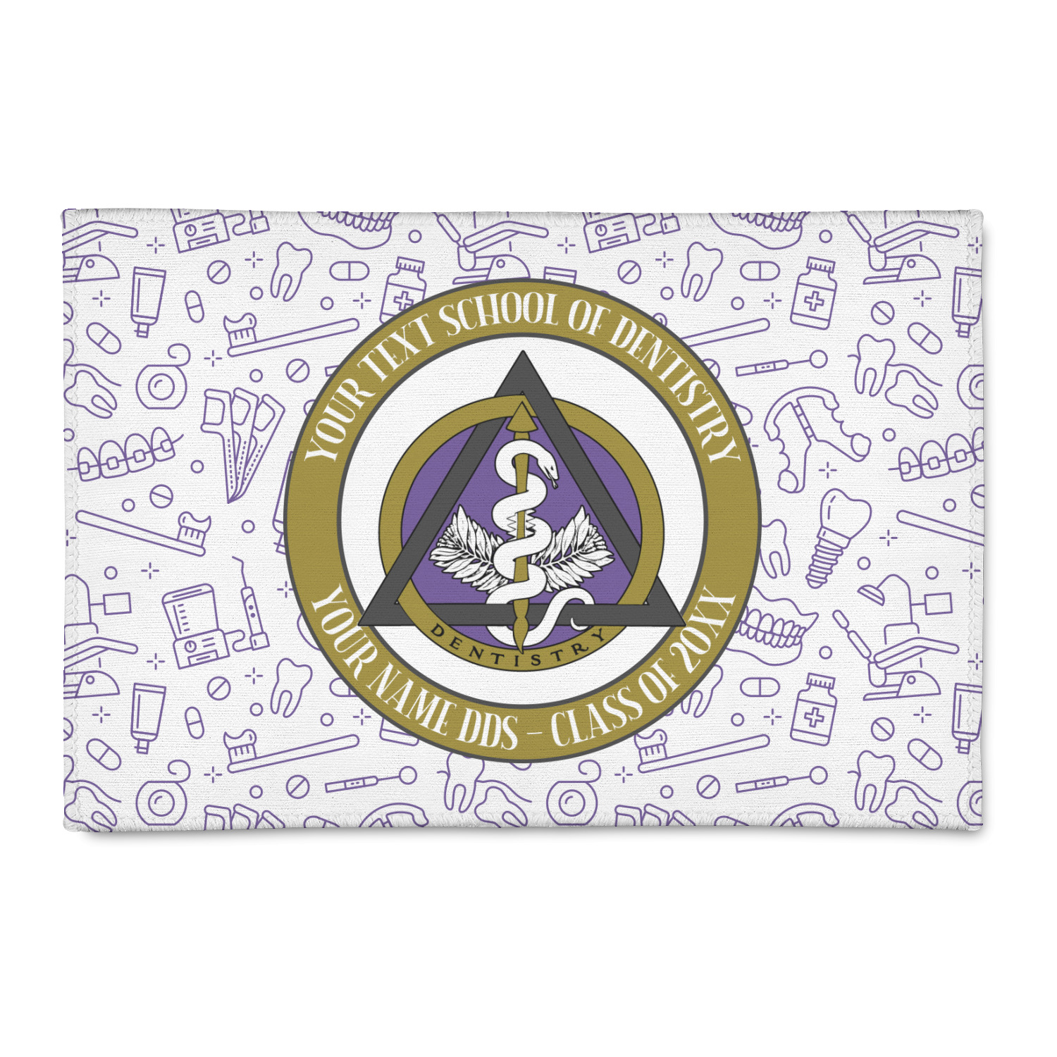 This design features the dental insignia (aka emblem, symbol, logo) at the center with personalization in a circle around the emblem.You can customize the name of the dental school, as well as the name of the dentist and the year they graduated.