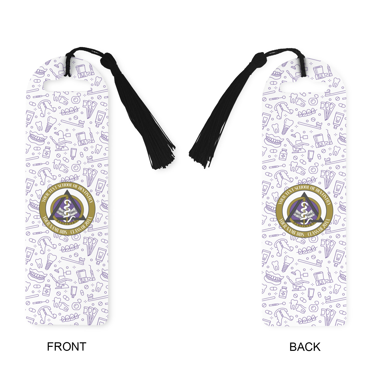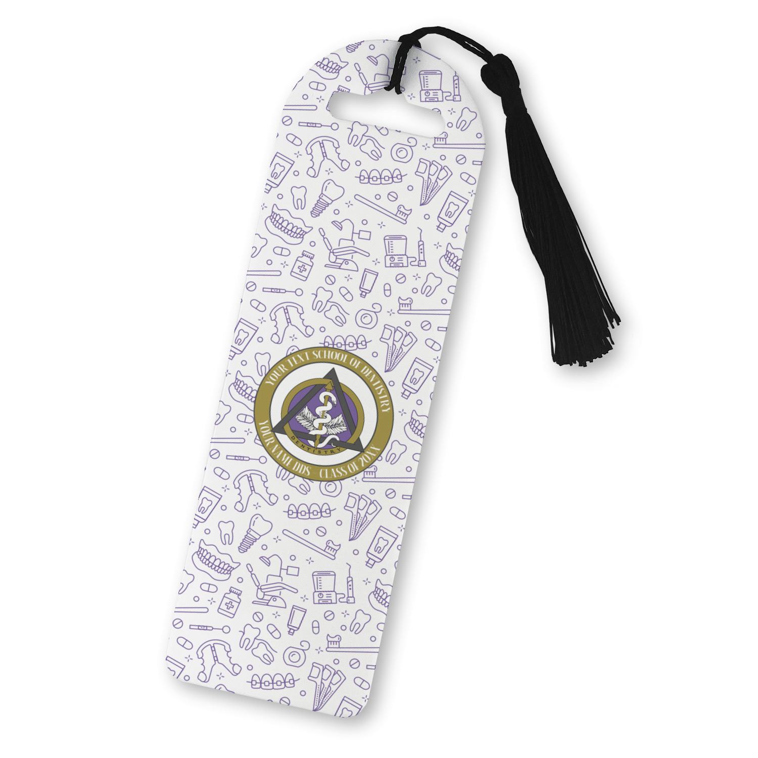 Made from a durable, flexible plastic, these bookmarks are printed with your custom design on them. With the tassel on them they make it easy to find your page in your book. These are a rectangular shape 7 1/4 inches tall with a rounded top and are approximately 2 1/4 inches wide.