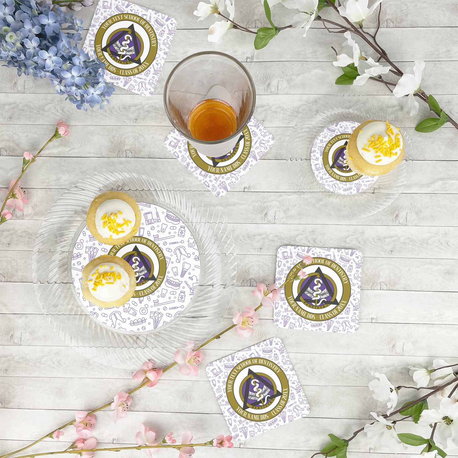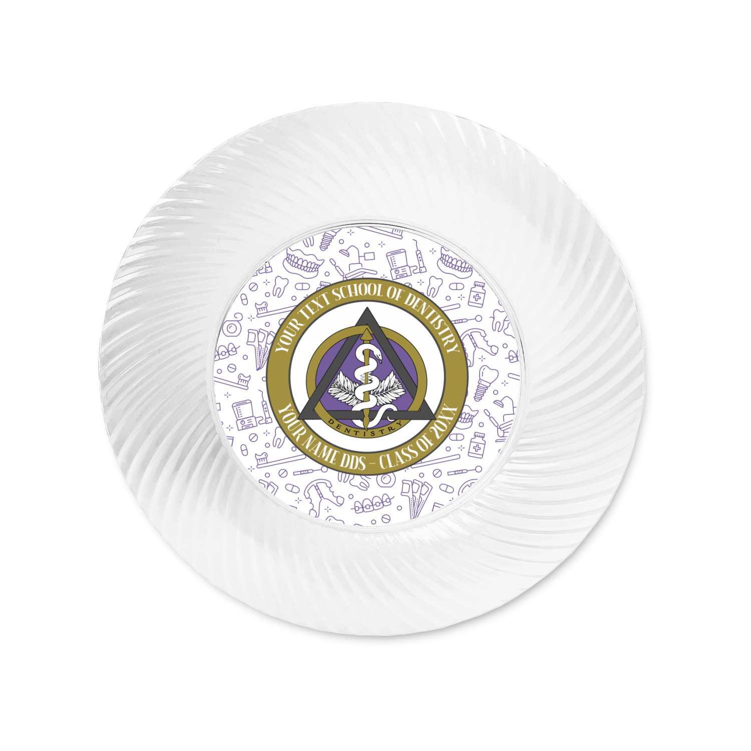This design features the dental insignia (aka emblem, symbol, logo) at the center with personalization in a circle around the emblem.You can customize the name of the dental school, as well as the name of the dentist and the year they graduated.