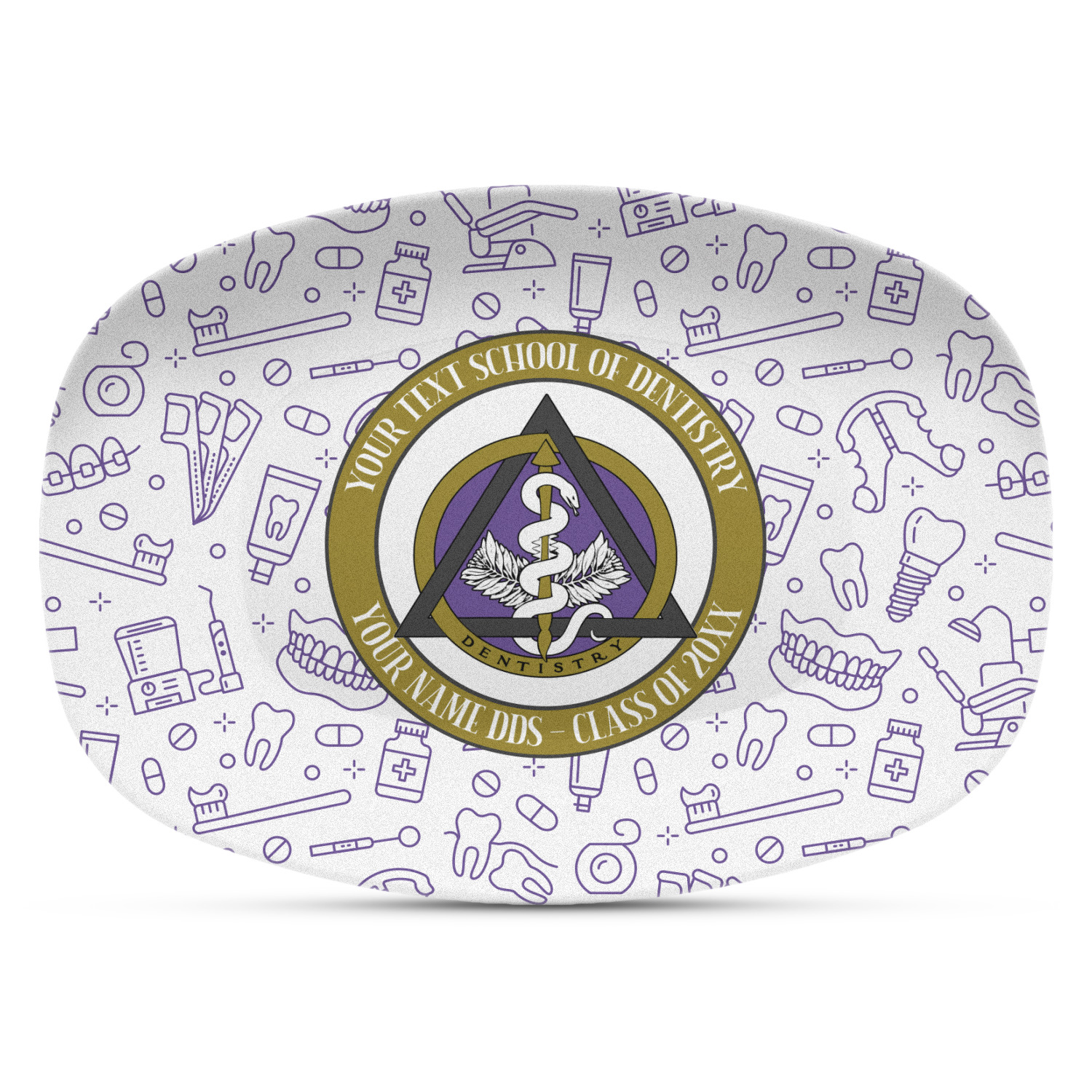 This design features the dental insignia (aka emblem, symbol, logo) at the center with personalization in a circle around the emblem.You can customize the name of the dental school, as well as the name of the dentist and the year they graduated.