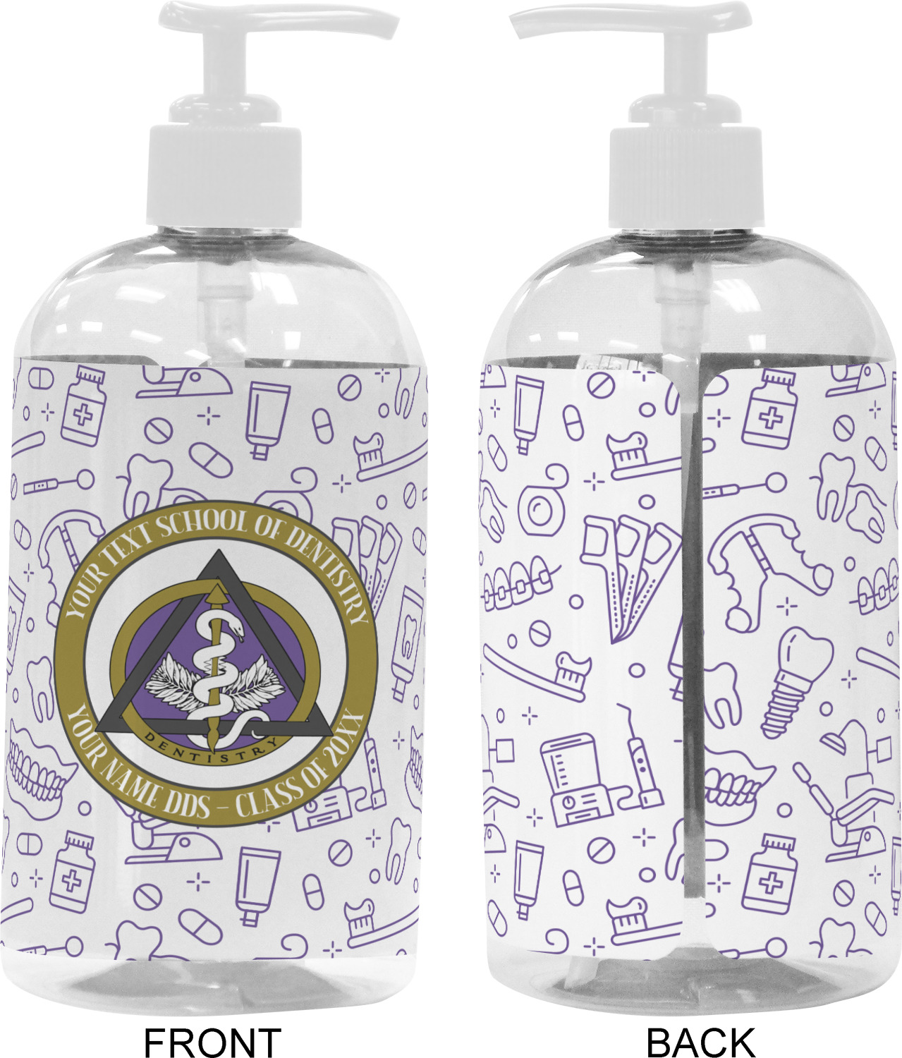 This design features the dental insignia (aka emblem, symbol, logo) at the center with personalization in a circle around the emblem.You can customize the name of the dental school, as well as the name of the dentist and the year they graduated.