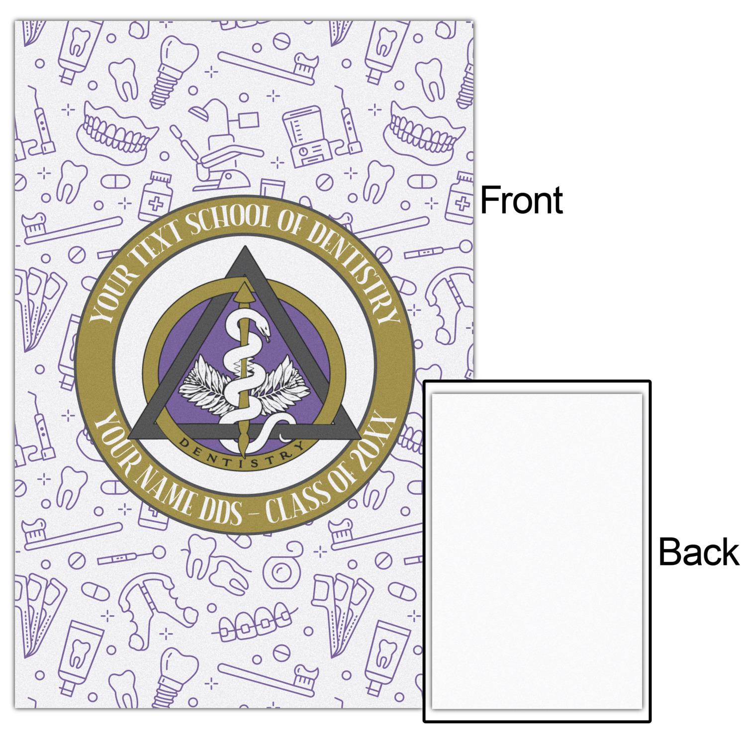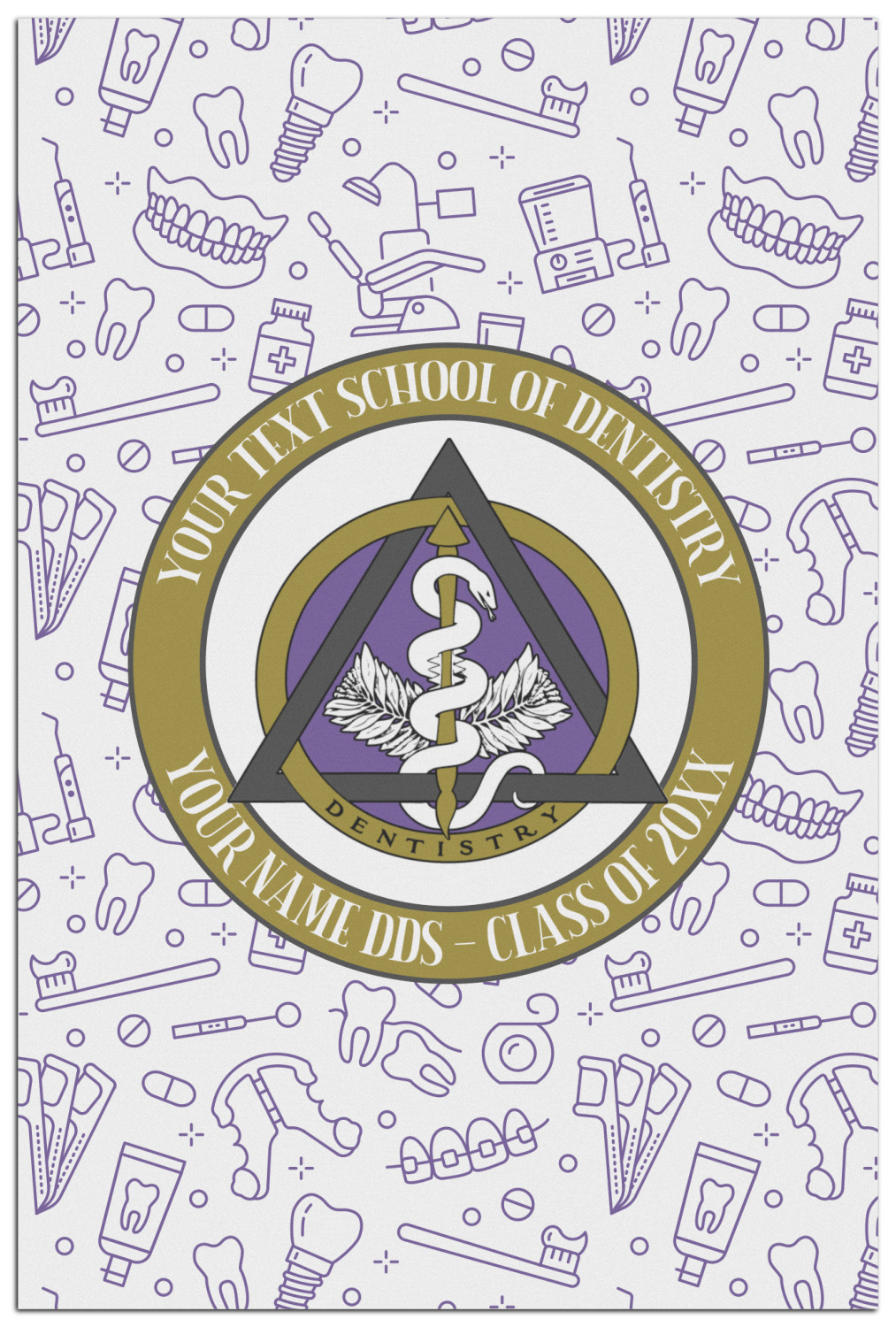 This design features the dental insignia (aka emblem, symbol, logo) at the center with personalization in a circle around the emblem.You can customize the name of the dental school, as well as the name of the dentist and the year they graduated.