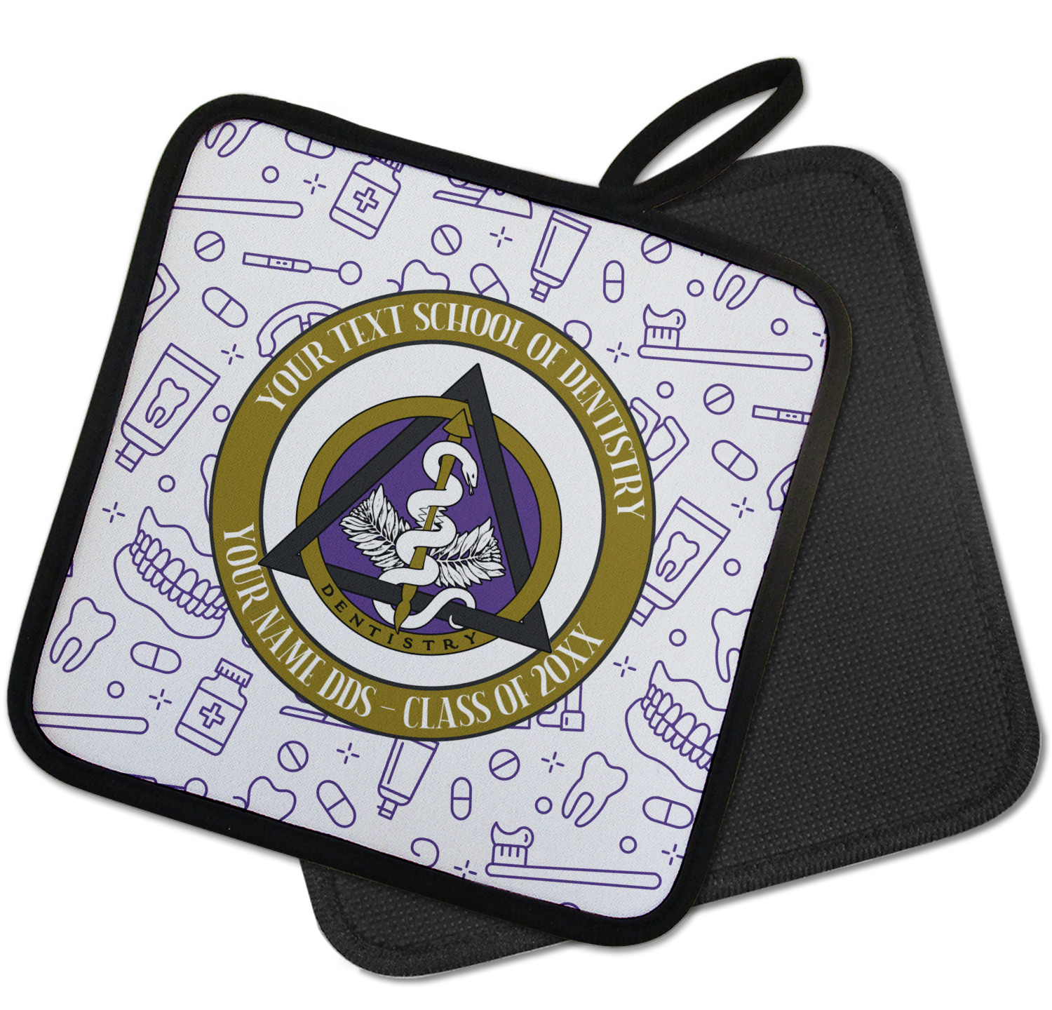 This design features the dental insignia (aka emblem, symbol, logo) at the center with personalization in a circle around the emblem.You can customize the name of the dental school, as well as the name of the dentist and the year they graduated.