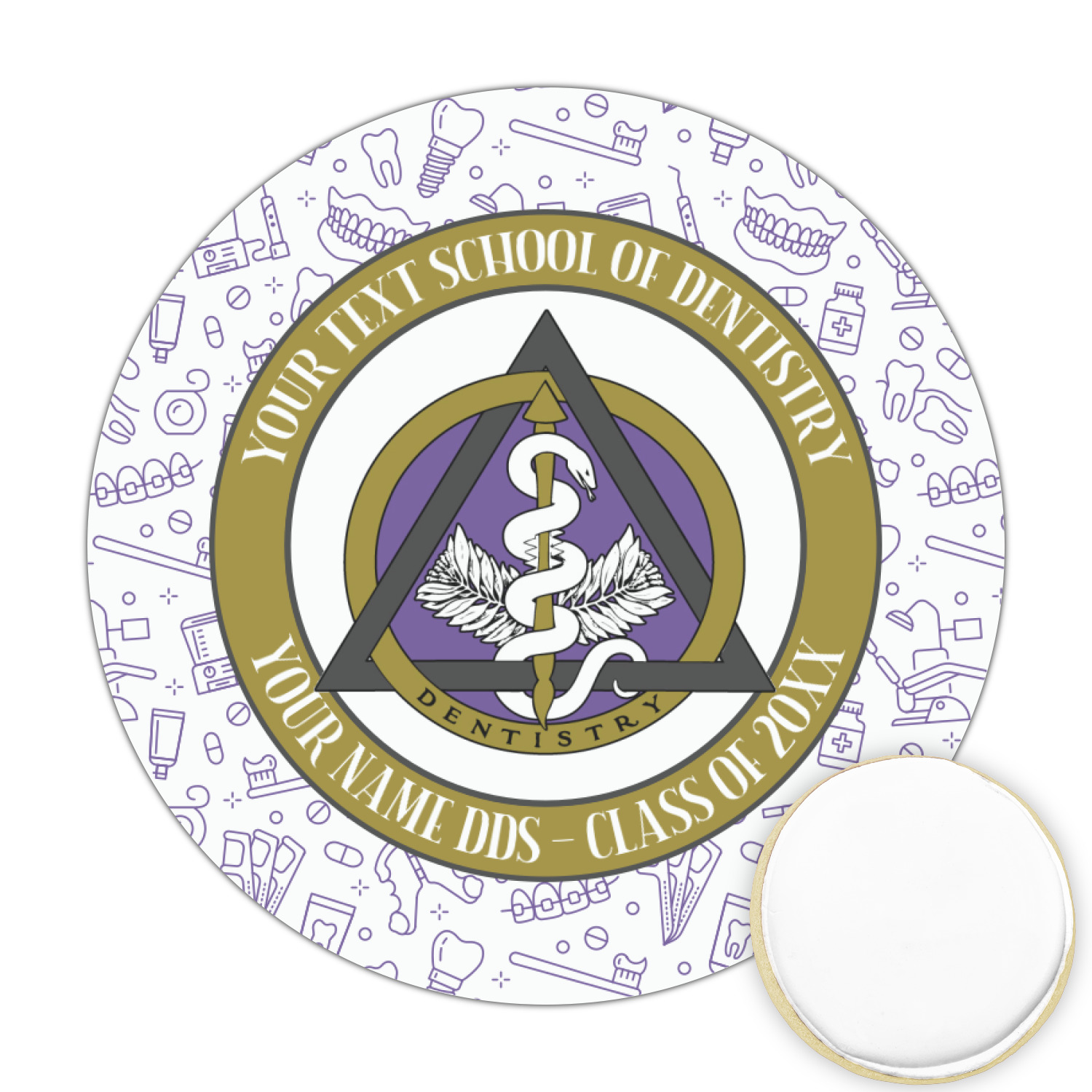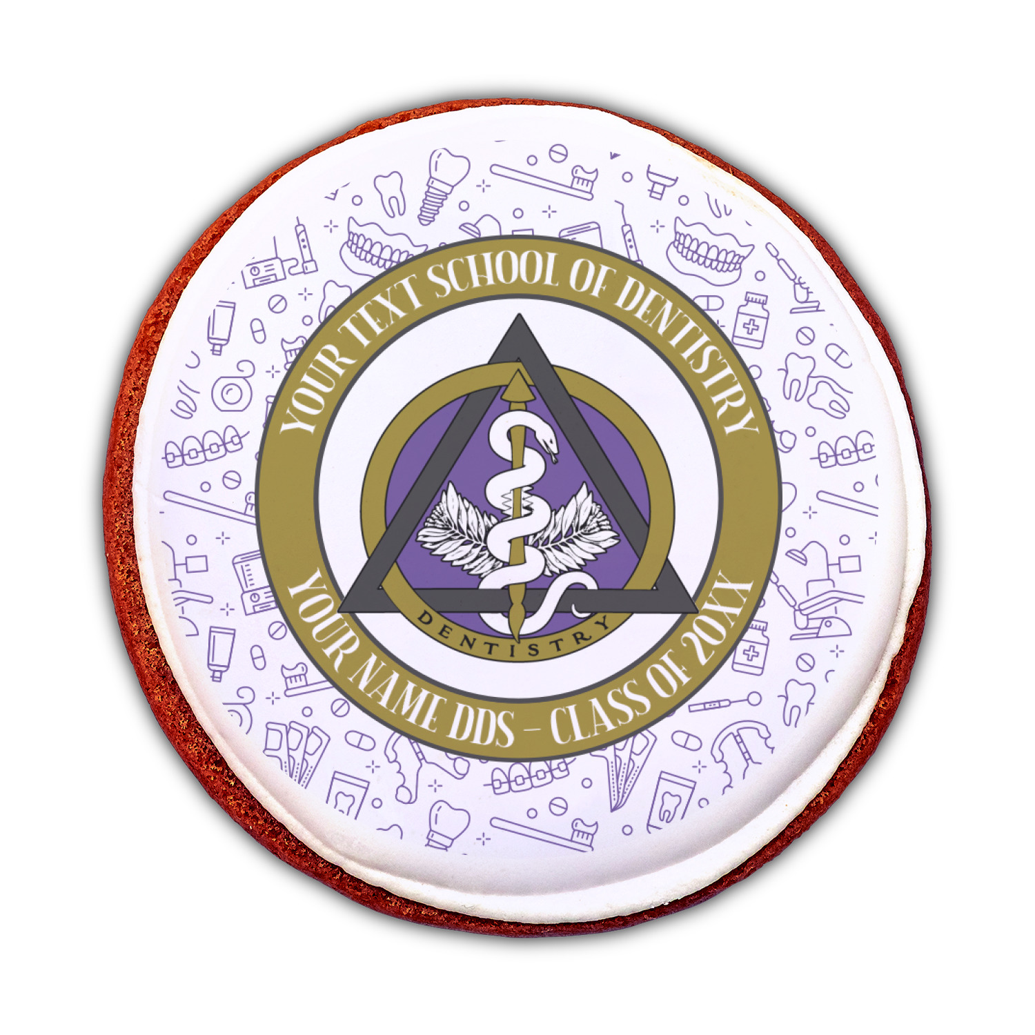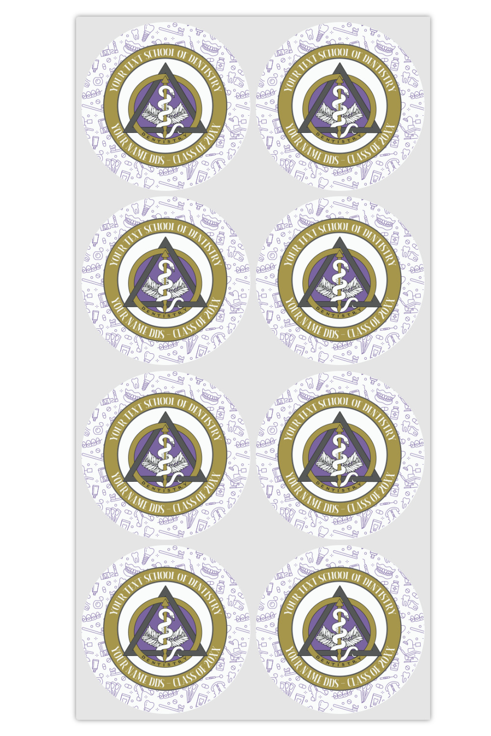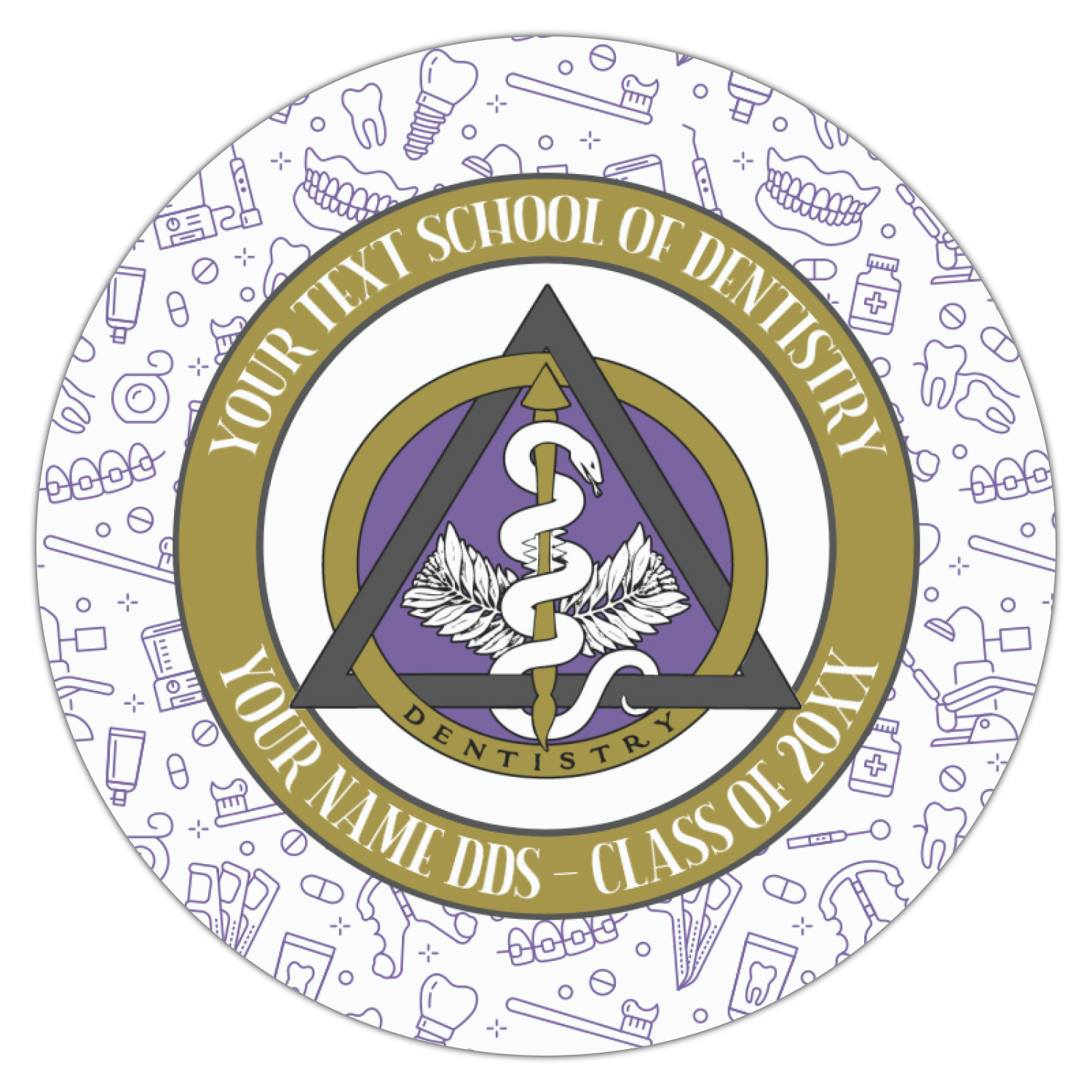 This design features the dental insignia (aka emblem, symbol, logo) at the center with personalization in a circle around the emblem.You can customize the name of the dental school, as well as the name of the dentist and the year they graduated.