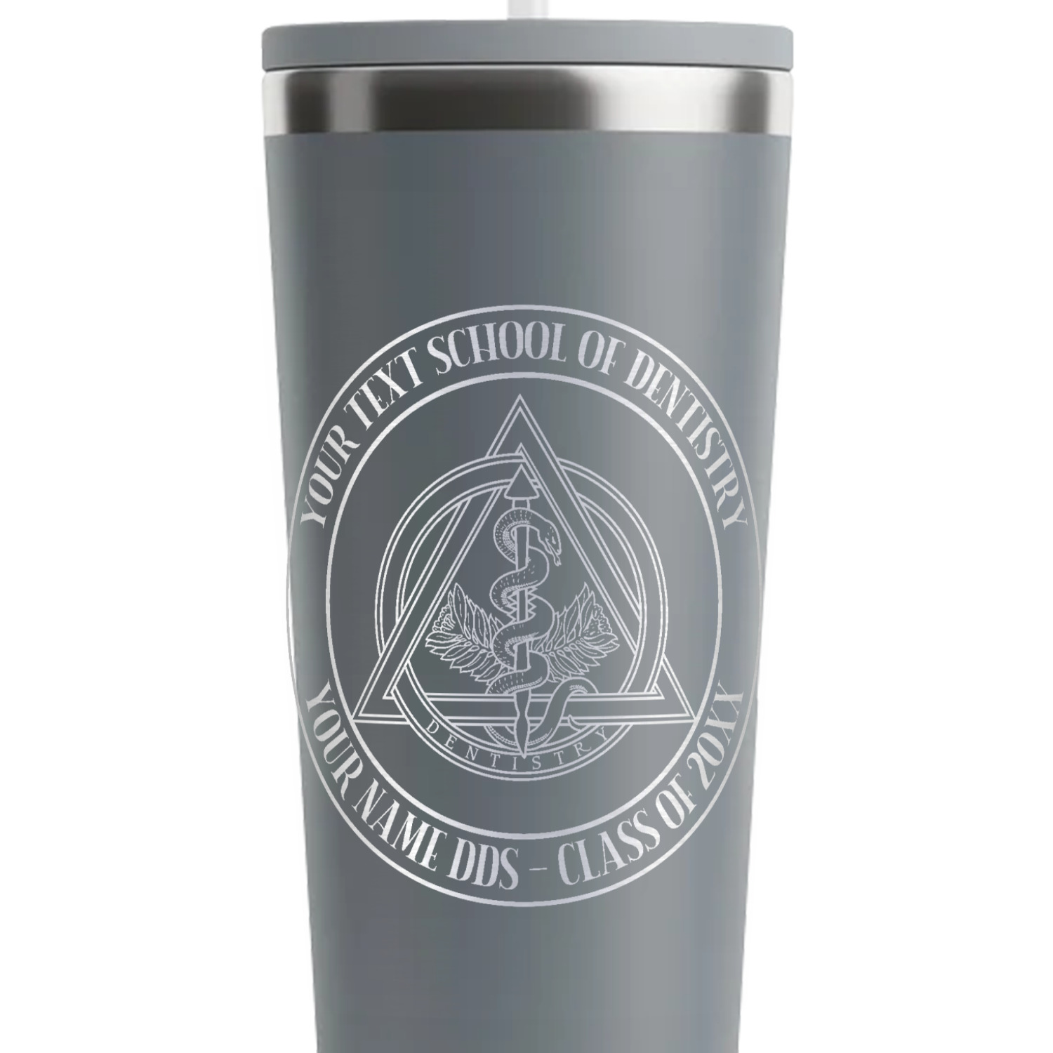 This design features the dental insignia (aka emblem, symbol, logo) at the center with personalization in a circle around the emblem.You can customize the name of the dental school, as well as the name of the dentist and the year they graduated.