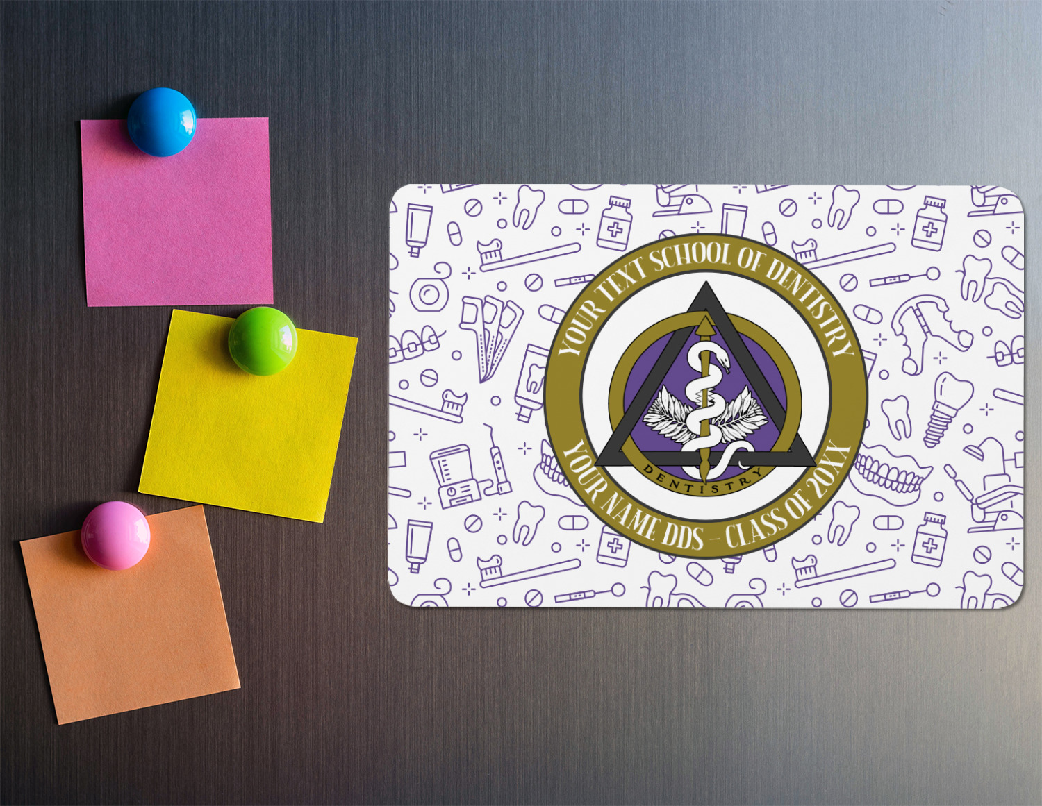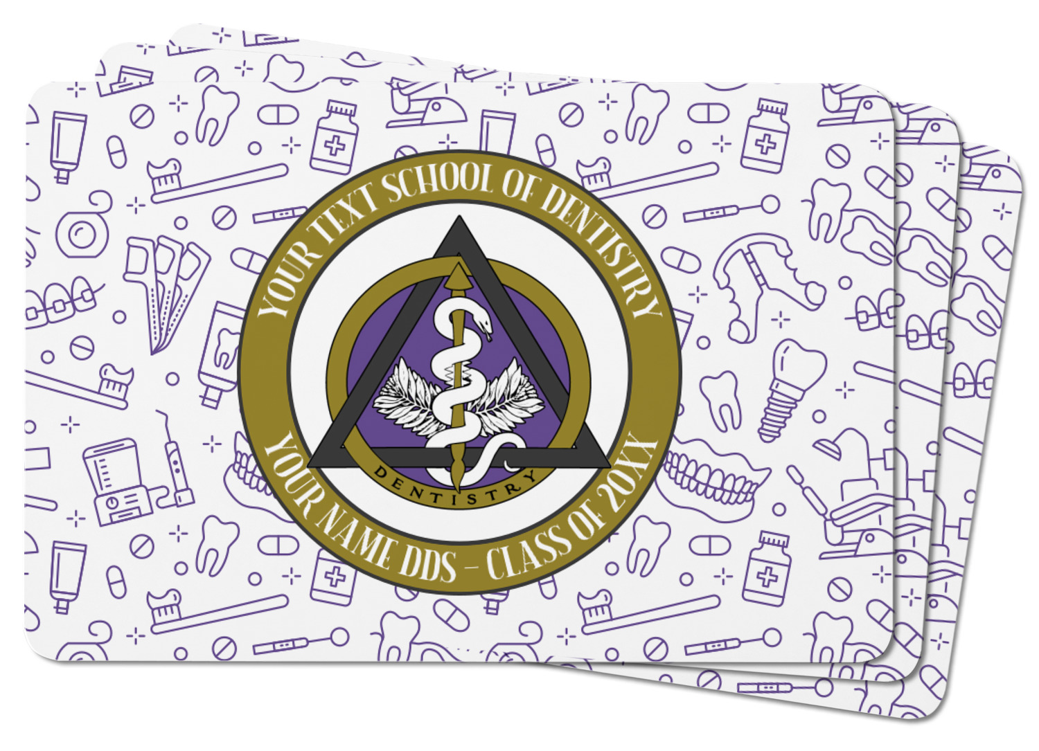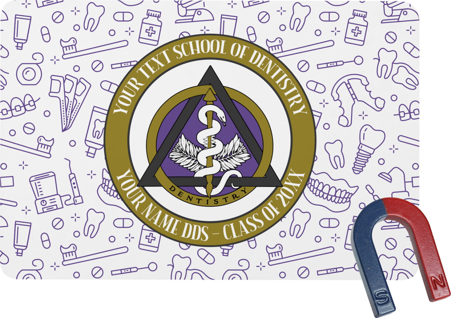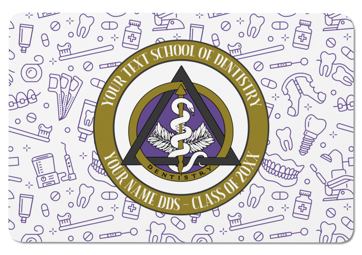 This design features the dental insignia (aka emblem, symbol, logo) at the center with personalization in a circle around the emblem.You can customize the name of the dental school, as well as the name of the dentist and the year they graduated.