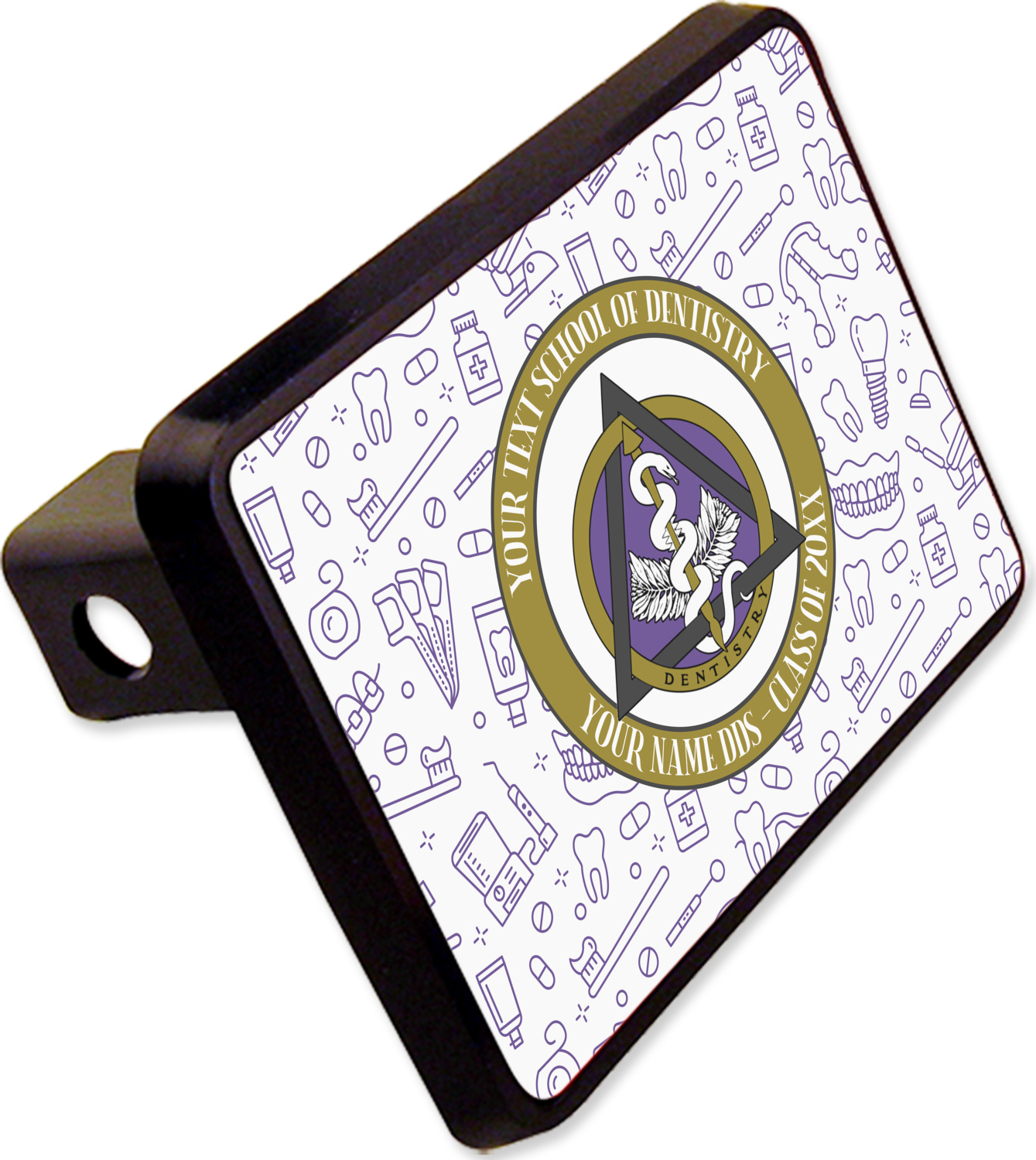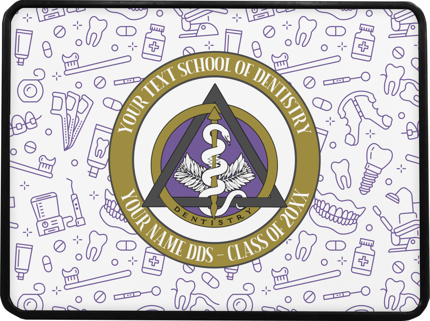 This design features the dental insignia (aka emblem, symbol, logo) at the center with personalization in a circle around the emblem.You can customize the name of the dental school, as well as the name of the dentist and the year they graduated.