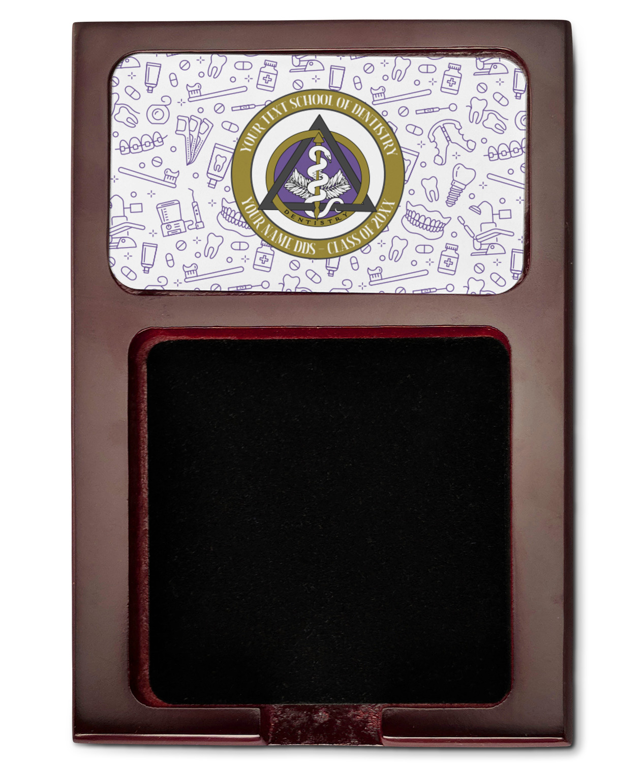 This design features the dental insignia (aka emblem, symbol, logo) at the center with personalization in a circle around the emblem.You can customize the name of the dental school, as well as the name of the dentist and the year they graduated.