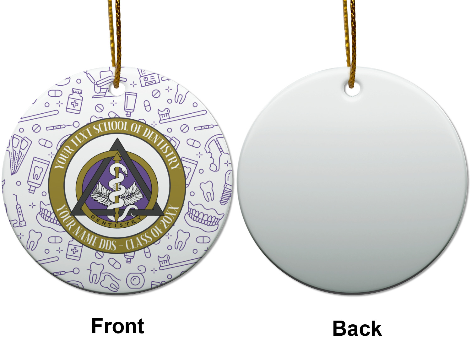 This design features the dental insignia (aka emblem, symbol, logo) at the center with personalization in a circle around the emblem.You can customize the name of the dental school, as well as the name of the dentist and the year they graduated.