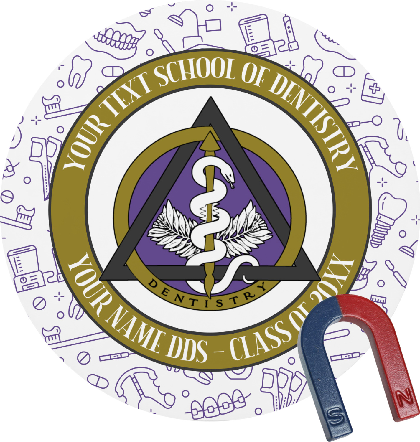 This design features the dental insignia (aka emblem, symbol, logo) at the center with personalization in a circle around the emblem.You can customize the name of the dental school, as well as the name of the dentist and the year they graduated.