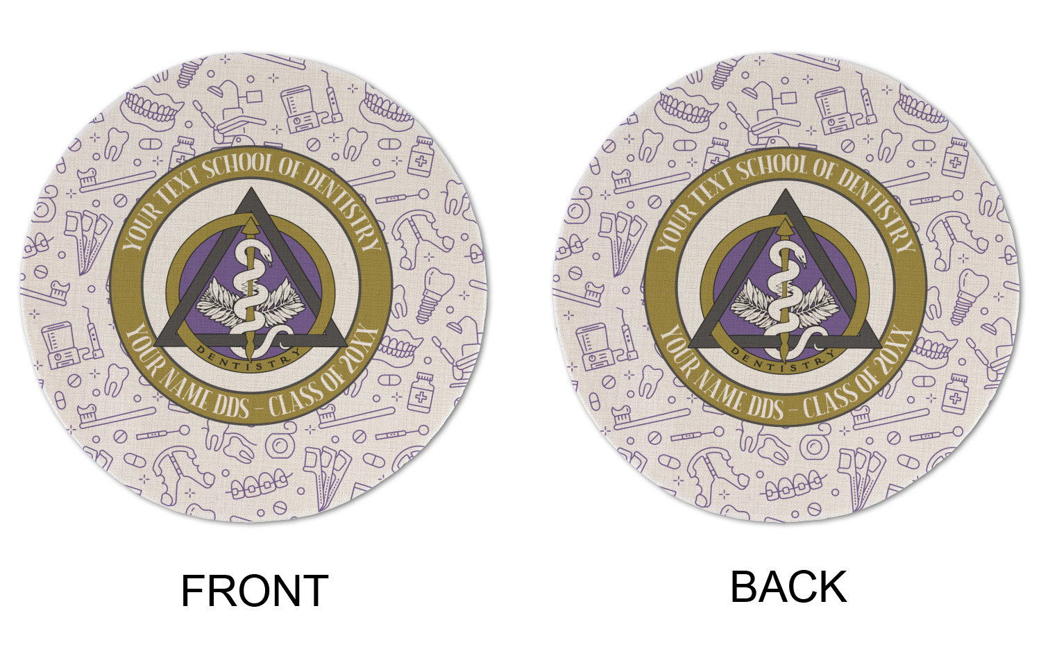 This design features the dental insignia (aka emblem, symbol, logo) at the center with personalization in a circle around the emblem.You can customize the name of the dental school, as well as the name of the dentist and the year they graduated.