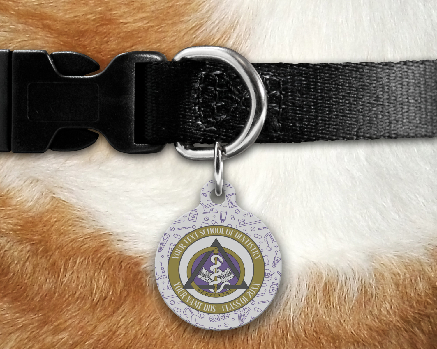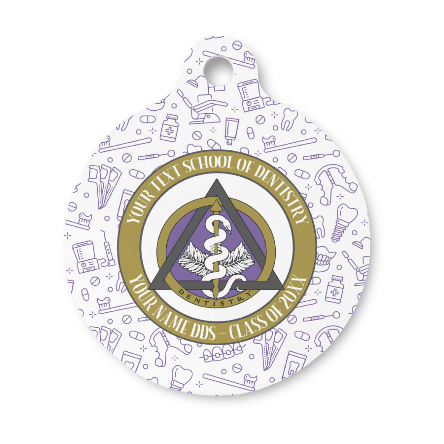 This design features the dental insignia (aka emblem, symbol, logo) at the center with personalization in a circle around the emblem.You can customize the name of the dental school, as well as the name of the dentist and the year they graduated.