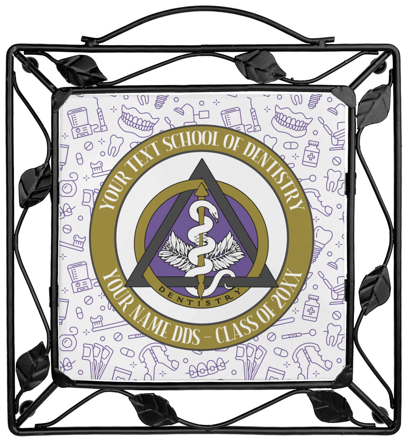 This design features the dental insignia (aka emblem, symbol, logo) at the center with personalization in a circle around the emblem.You can customize the name of the dental school, as well as the name of the dentist and the year they graduated.
