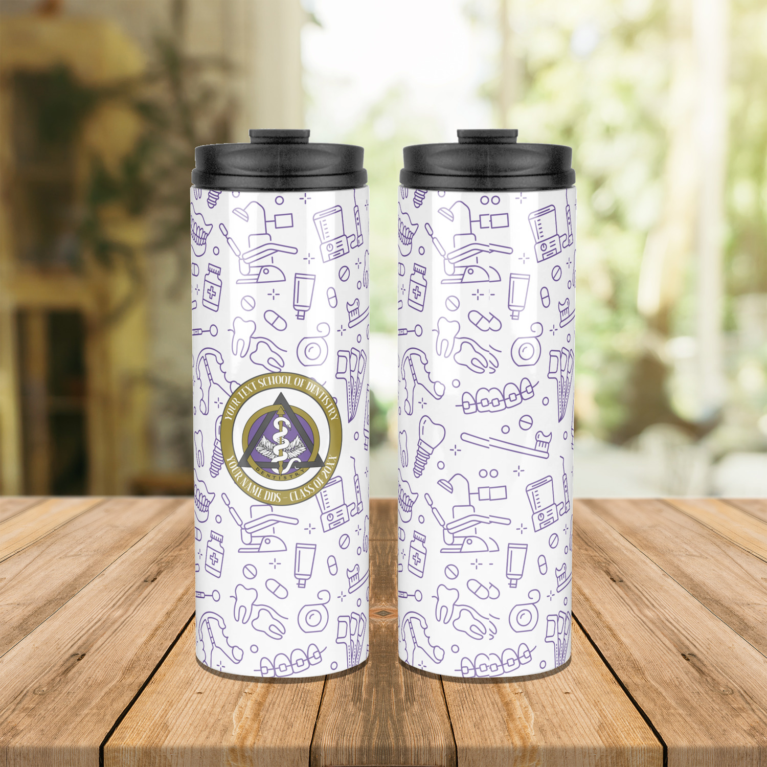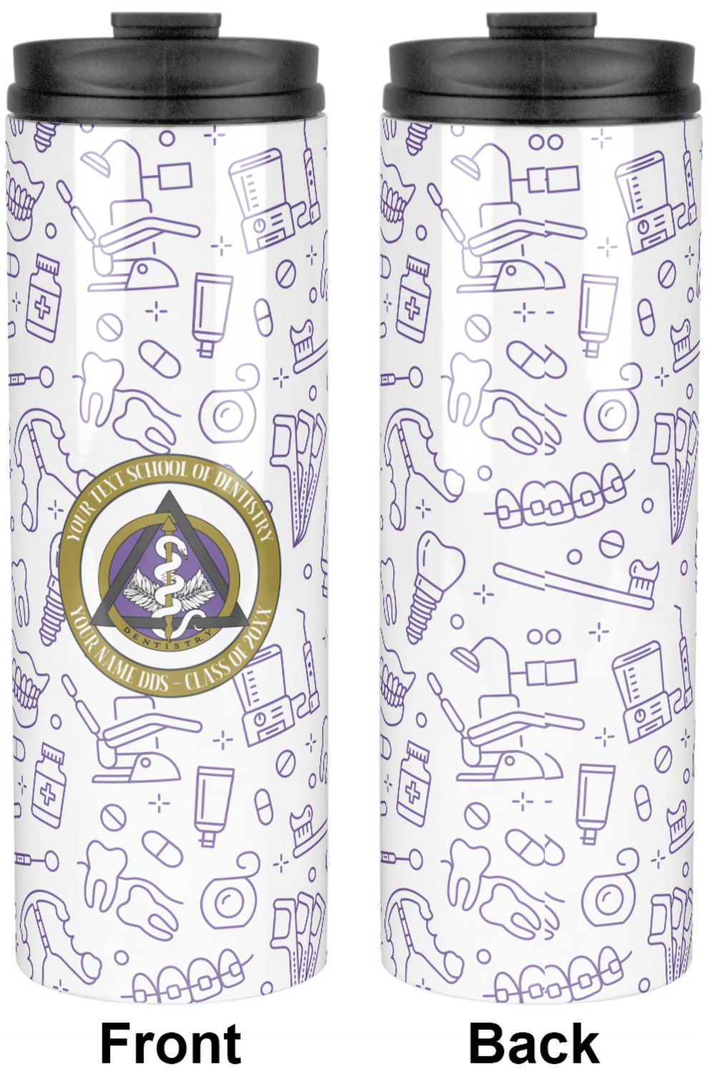 This design features the dental insignia (aka emblem, symbol, logo) at the center with personalization in a circle around the emblem.You can customize the name of the dental school, as well as the name of the dentist and the year they graduated.