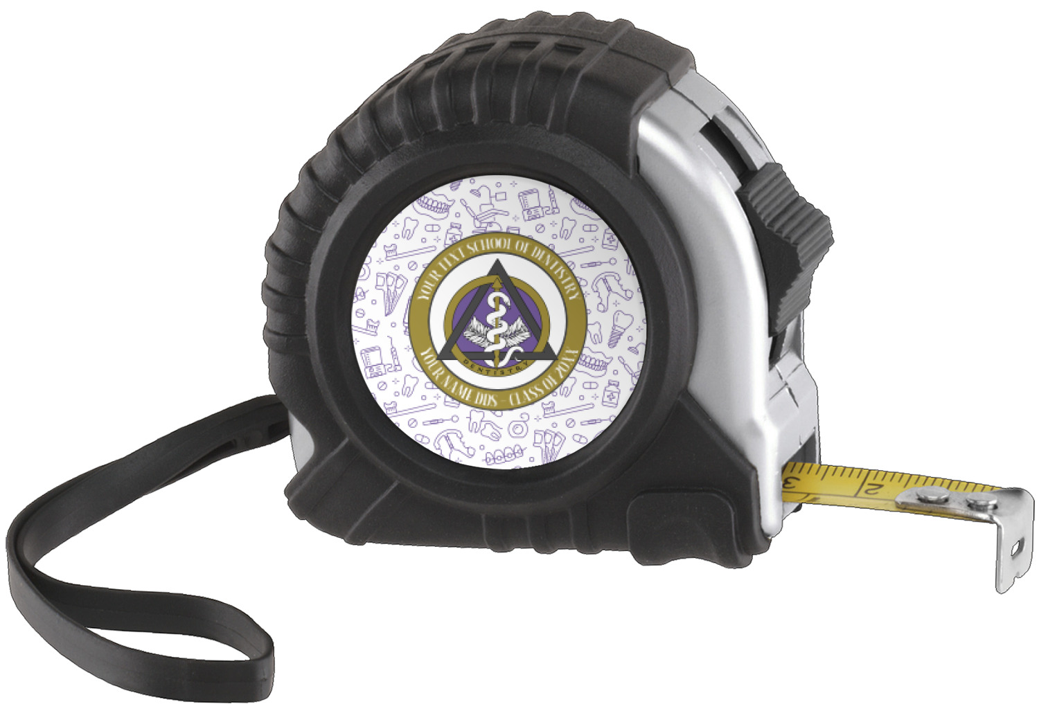 This design features the dental insignia (aka emblem, symbol, logo) at the center with personalization in a circle around the emblem.You can customize the name of the dental school, as well as the name of the dentist and the year they graduated.