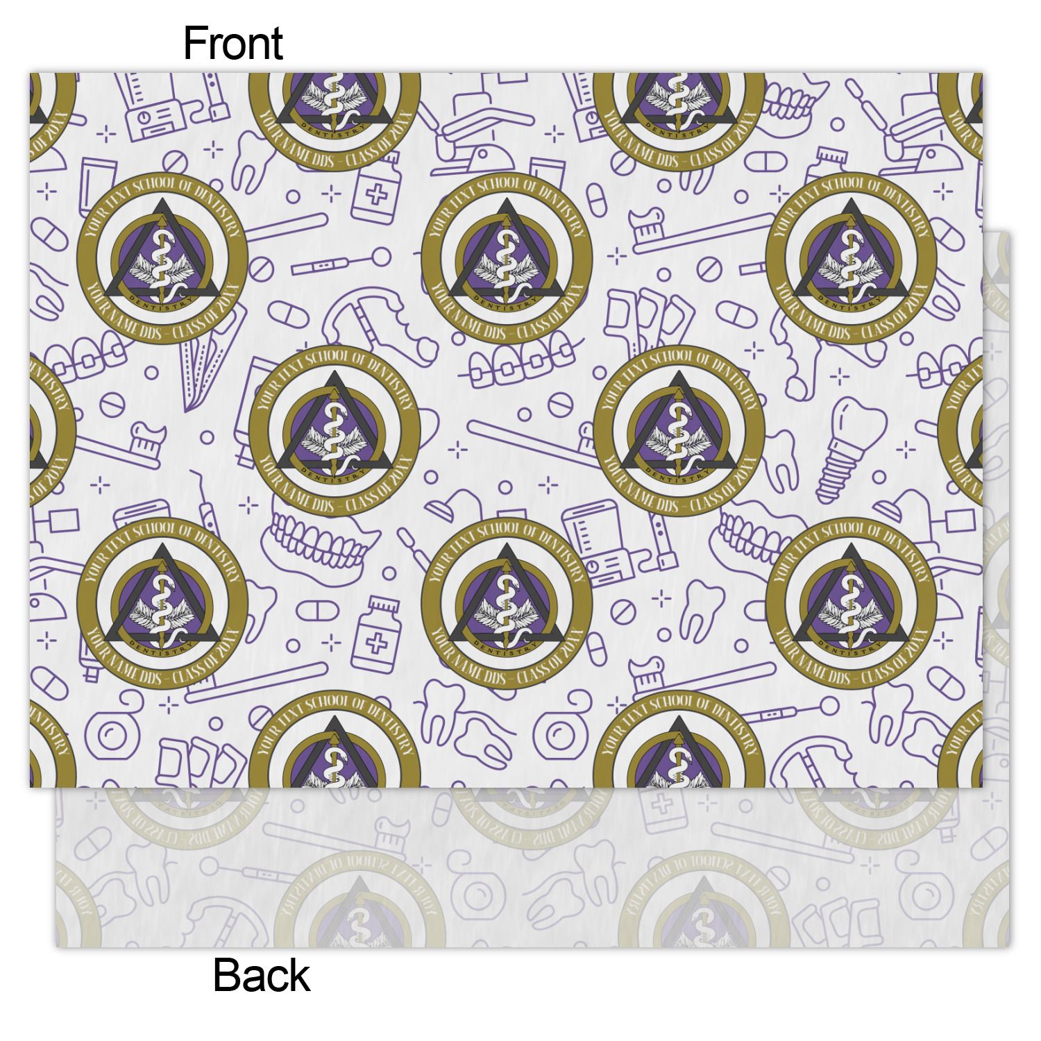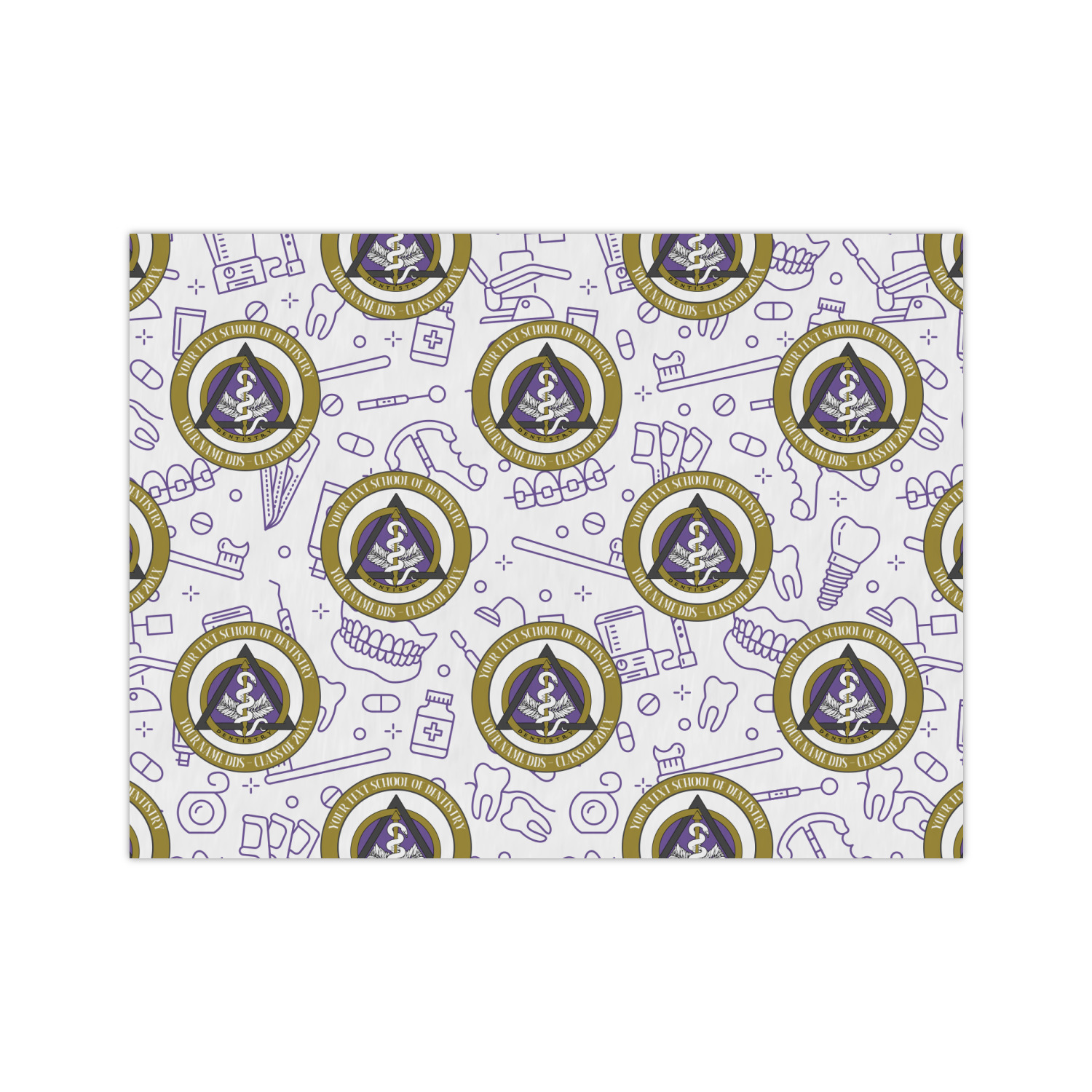 This design features the dental insignia (aka emblem, symbol, logo) at the center with personalization in a circle around the emblem.You can customize the name of the dental school, as well as the name of the dentist and the year they graduated.