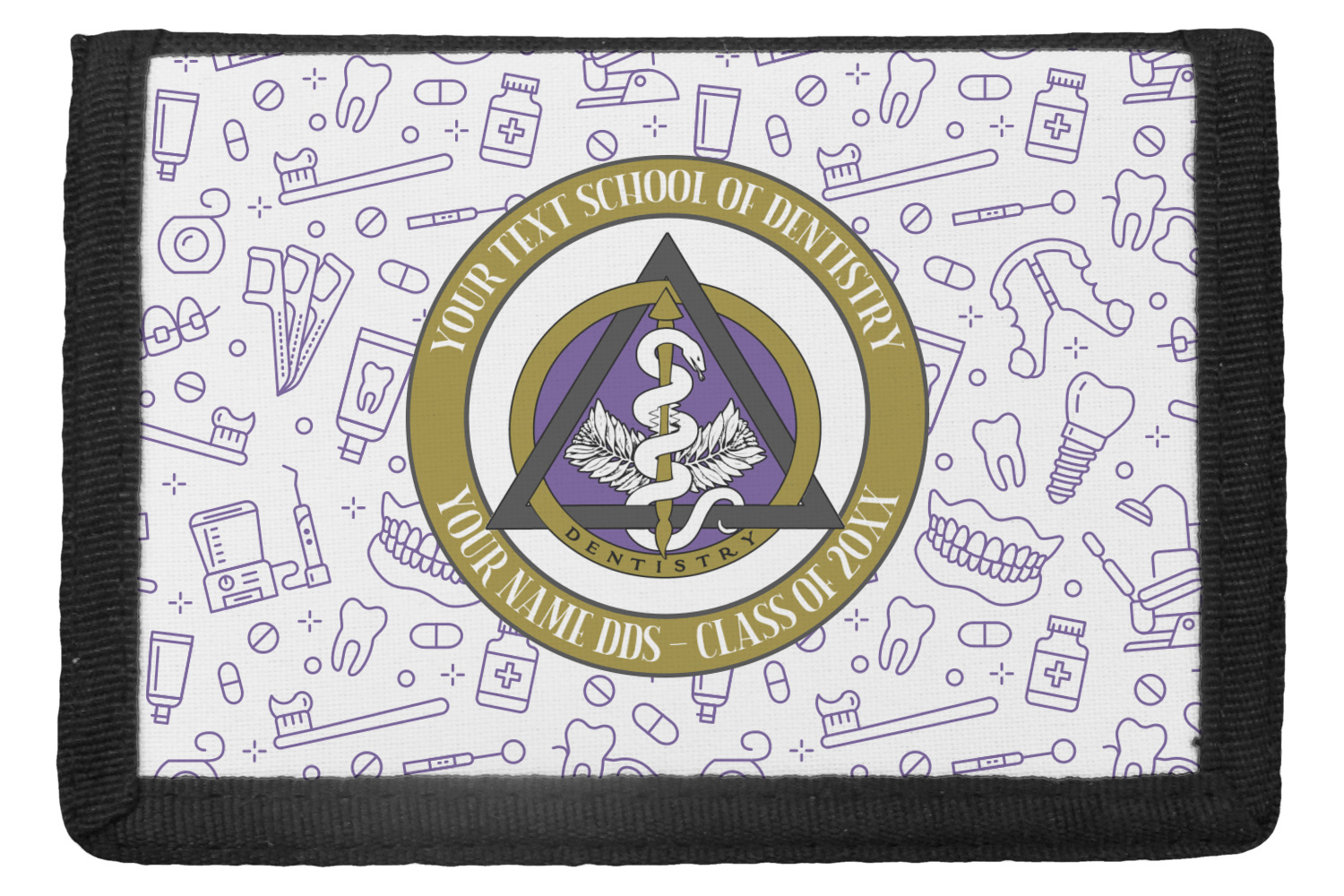 This design features the dental insignia (aka emblem, symbol, logo) at the center with personalization in a circle around the emblem.You can customize the name of the dental school, as well as the name of the dentist and the year they graduated.