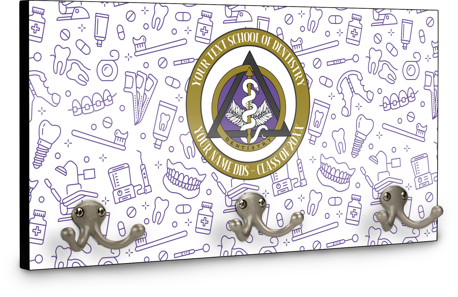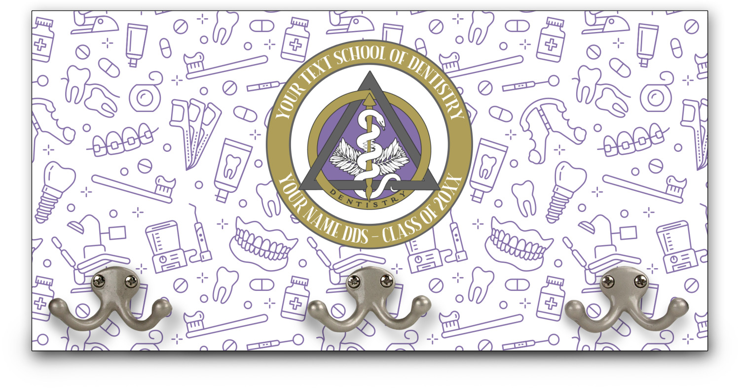 This design features the dental insignia (aka emblem, symbol, logo) at the center with personalization in a circle around the emblem.You can customize the name of the dental school, as well as the name of the dentist and the year they graduated.