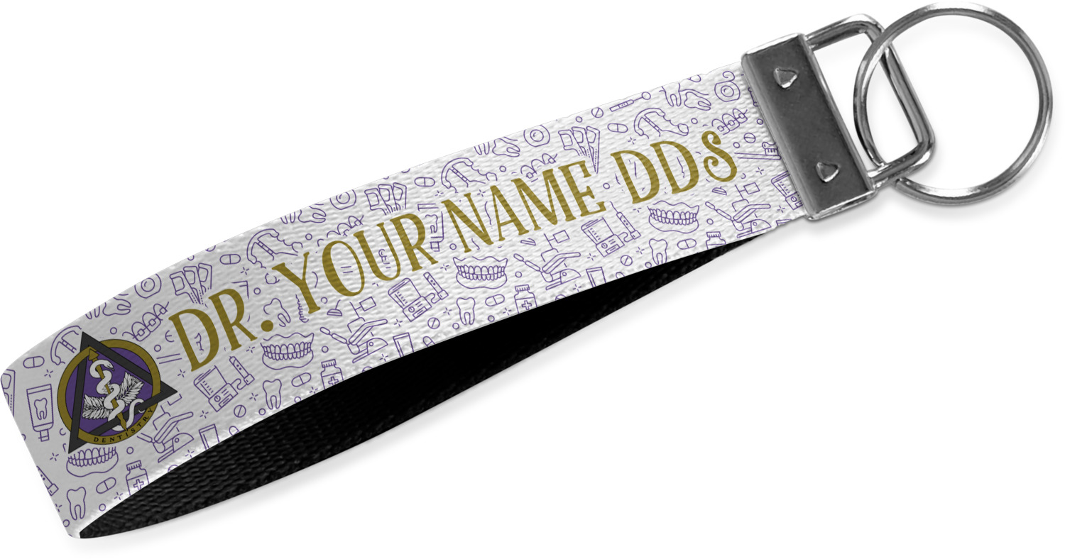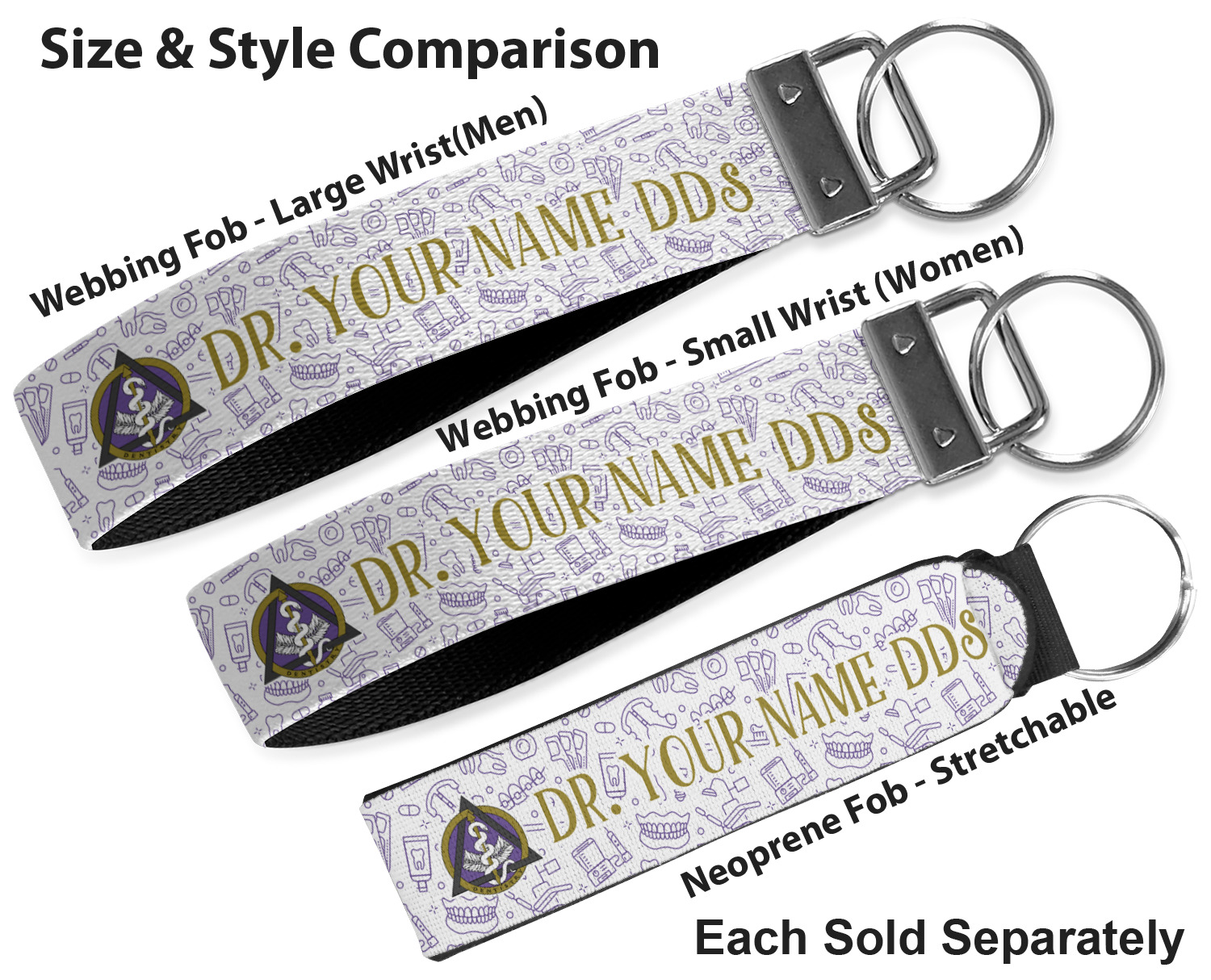 These key fob keychains are made from a polyester weave, right here in the USA. They feature a silver, metal clasp, attached to a round keyring. The piece gives the personalized wristlet a beautiful, finished look. Your customized design is printed on the outside of the keychain strap. We carry these wristlets in two sizes: small, which is 5 inches in width, and large, which is 5.5 inches in width.