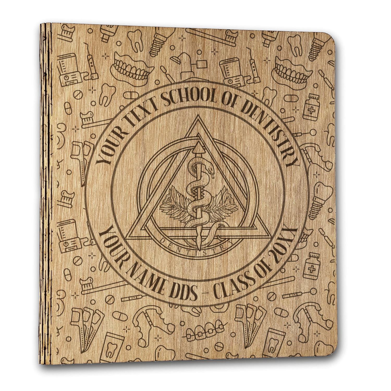This design features the dental insignia (aka emblem, symbol, logo) at the center with personalization in a circle around the emblem.You can customize the name of the dental school, as well as the name of the dentist and the year they graduated.