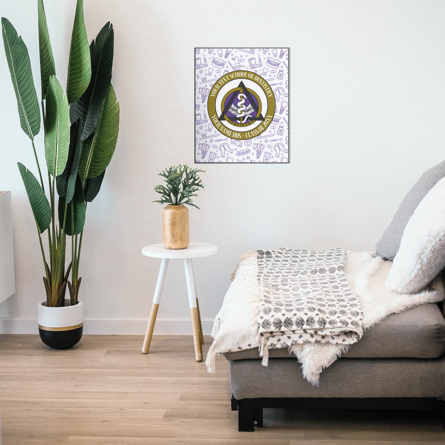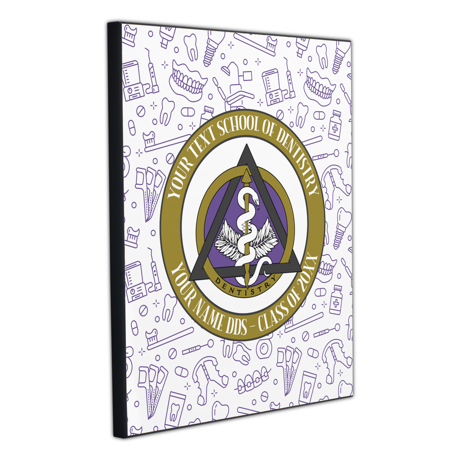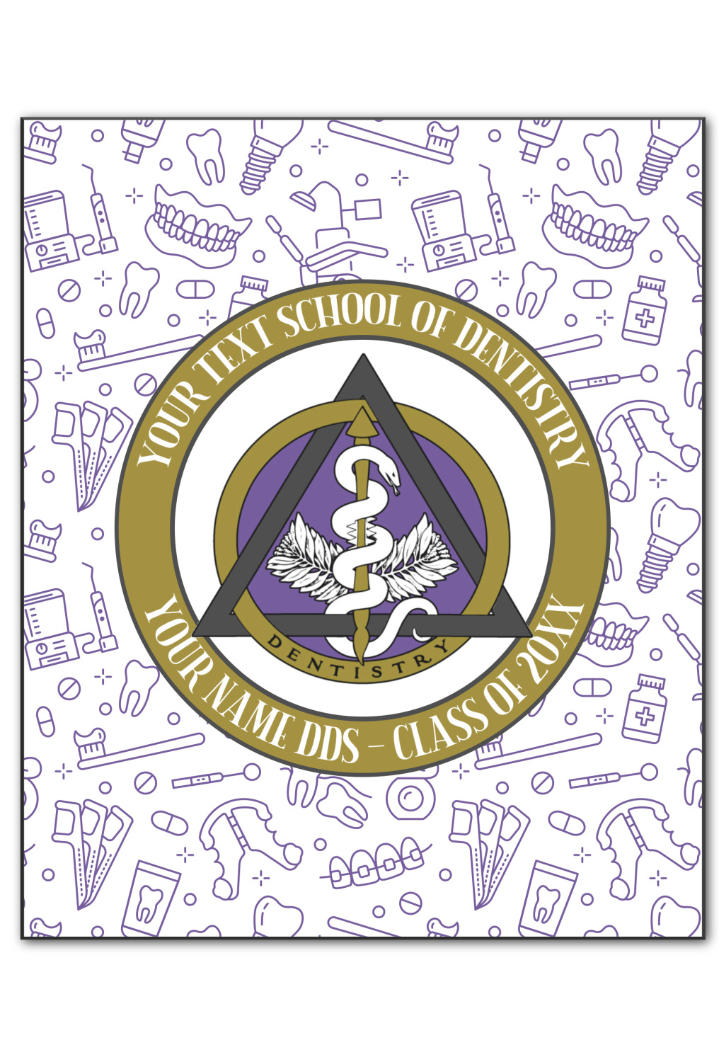 This design features the dental insignia (aka emblem, symbol, logo) at the center with personalization in a circle around the emblem.You can customize the name of the dental school, as well as the name of the dentist and the year they graduated.