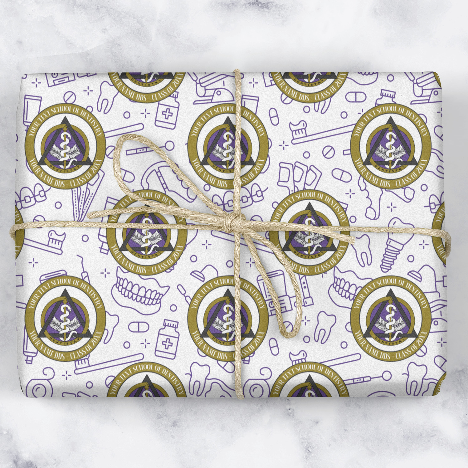 This design features the dental insignia (aka emblem, symbol, logo) at the center with personalization in a circle around the emblem.You can customize the name of the dental school, as well as the name of the dentist and the year they graduated.