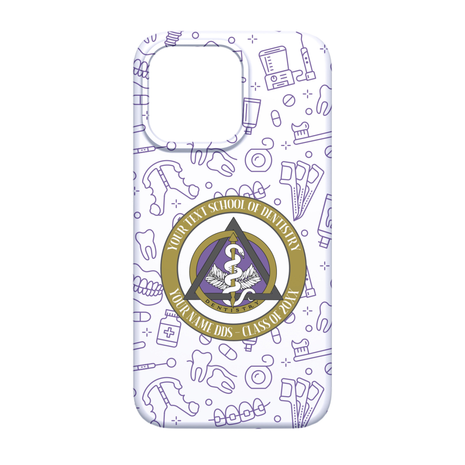 This design features the dental insignia (aka emblem, symbol, logo) at the center with personalization in a circle around the emblem.You can customize the name of the dental school, as well as the name of the dentist and the year they graduated.