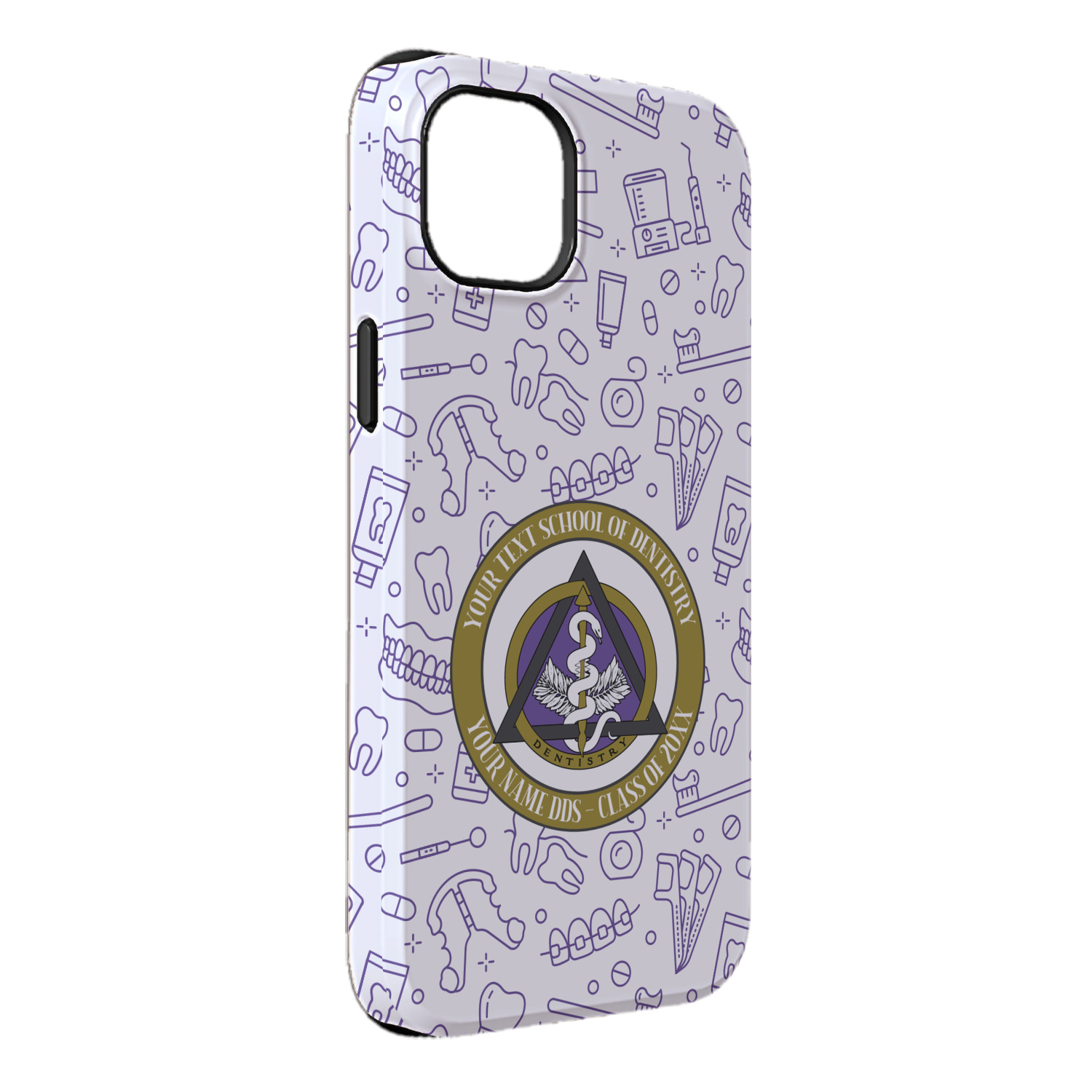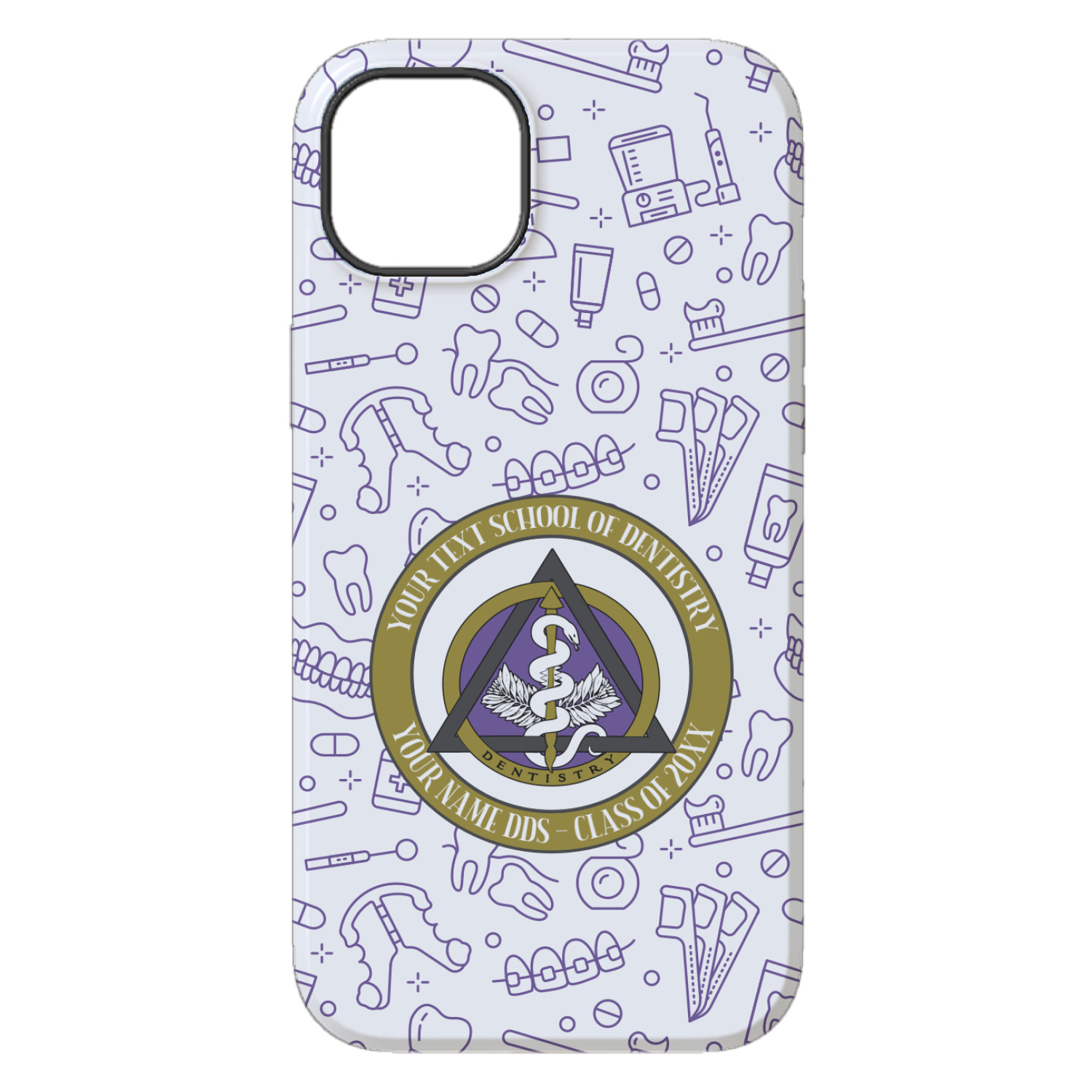 This design features the dental insignia (aka emblem, symbol, logo) at the center with personalization in a circle around the emblem.You can customize the name of the dental school, as well as the name of the dentist and the year they graduated.
