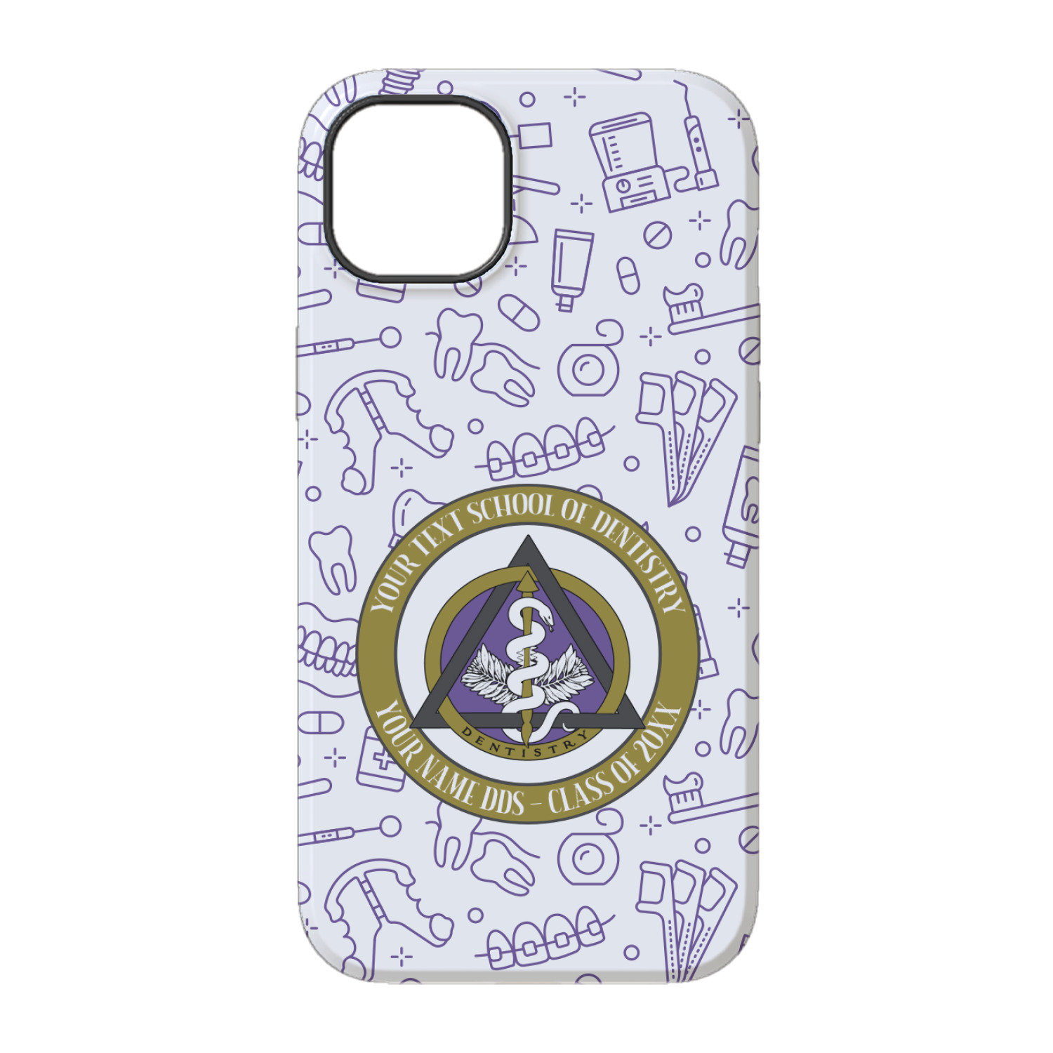 This design features the dental insignia (aka emblem, symbol, logo) at the center with personalization in a circle around the emblem.You can customize the name of the dental school, as well as the name of the dentist and the year they graduated.