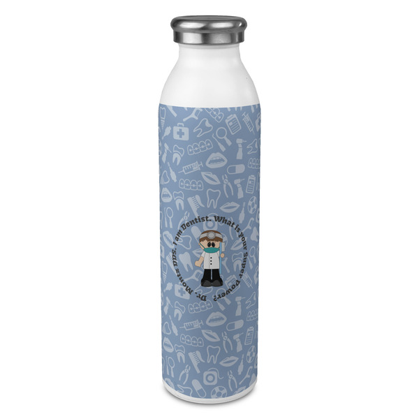 This design is a light blue with dark blue accents in its background. The design features a fun little cartoon dentist that will just make you smile. The text surrounding the little dentist will be the perfect place for a dentist pun or your name!