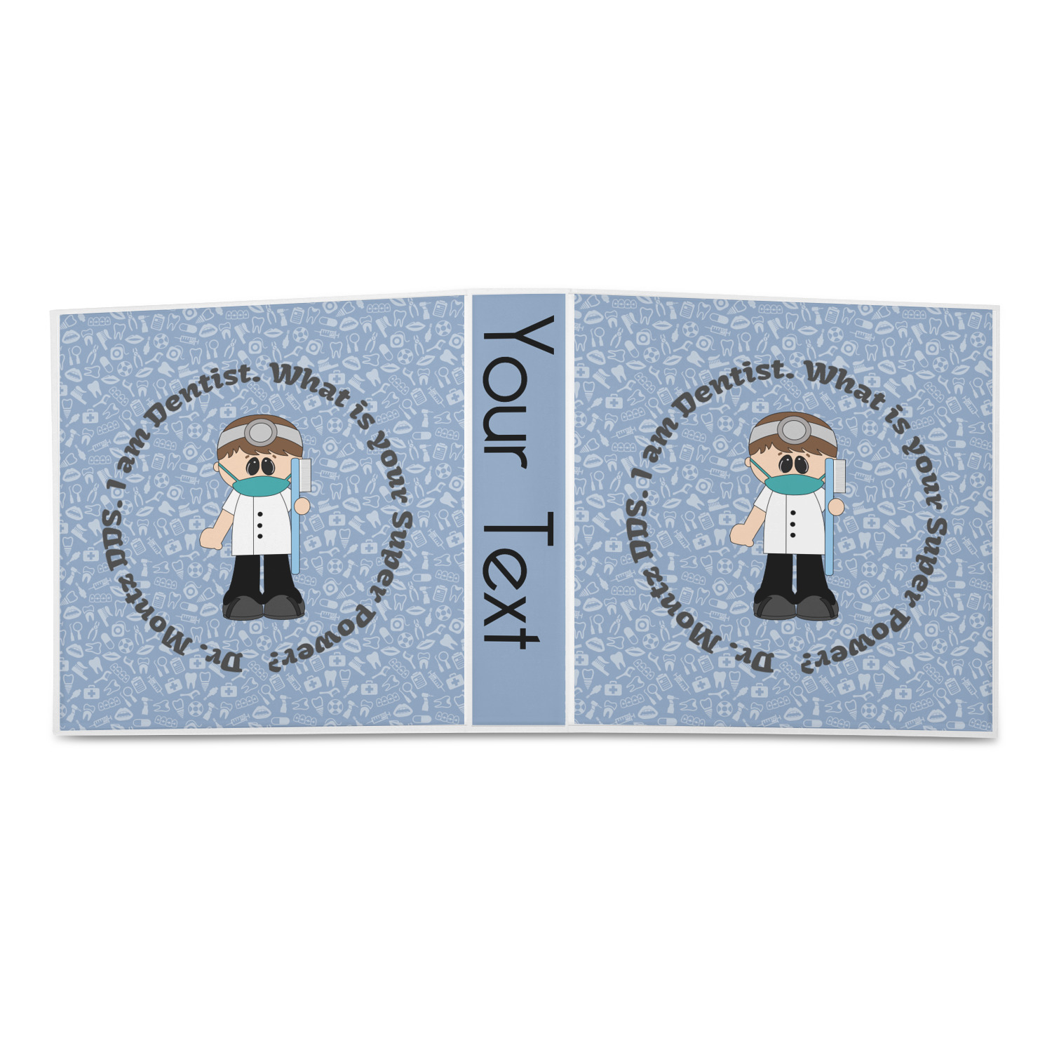 This design is a light blue with dark blue accents in its background. The design features a fun little cartoon dentist that will just make you smile. The text surrounding the little dentist will be the perfect place for a dentist pun or your name!
