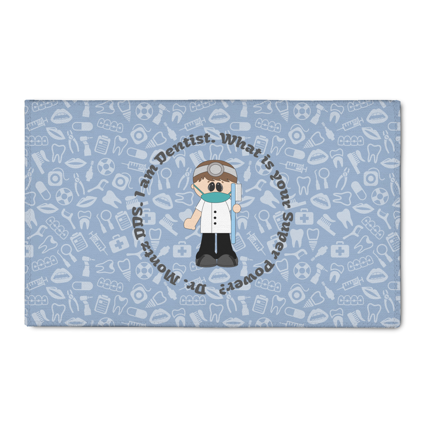 This design is a light blue with dark blue accents in its background. The design features a fun little cartoon dentist that will just make you smile. The text surrounding the little dentist will be the perfect place for a dentist pun or your name!