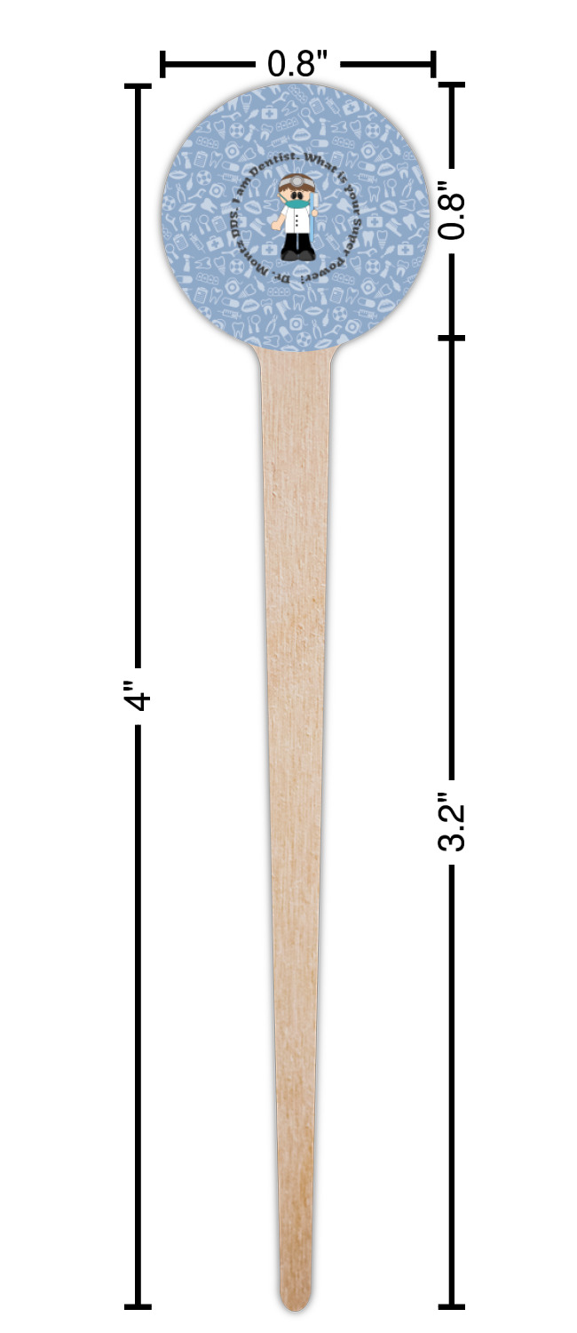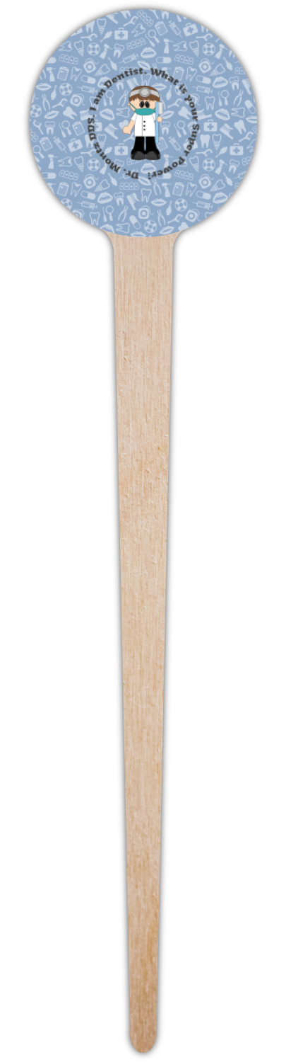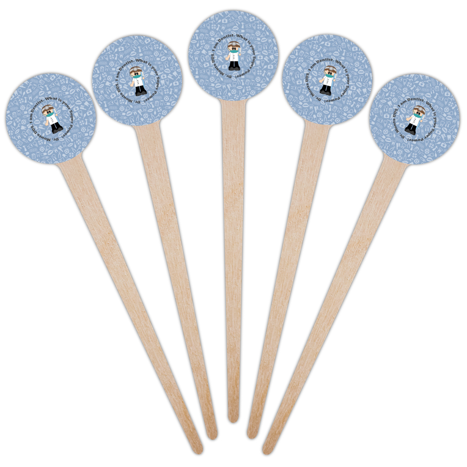 This design is a light blue with dark blue accents in its background. The design features a fun little cartoon dentist that will just make you smile. The text surrounding the little dentist will be the perfect place for a dentist pun or your name!