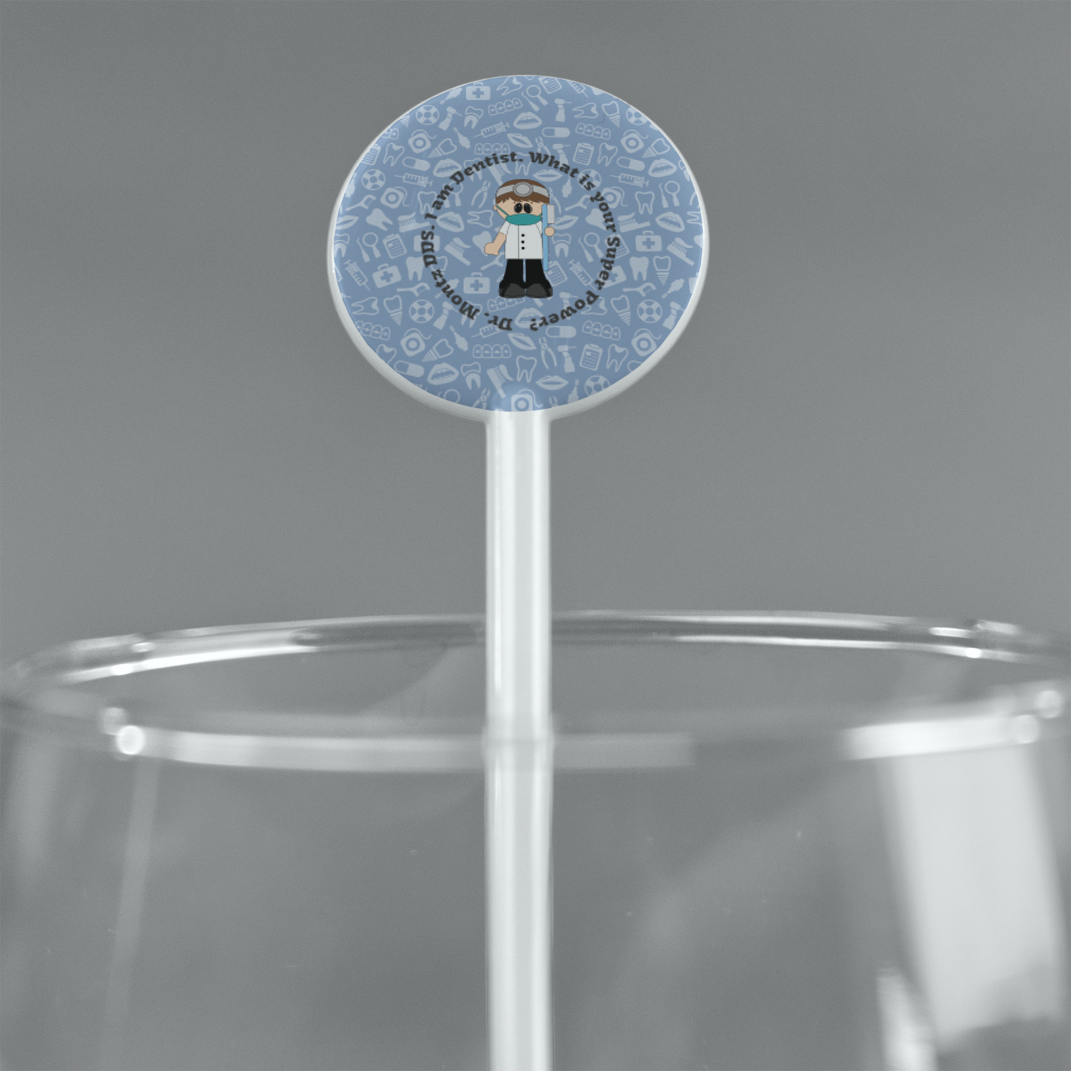 This design is a light blue with dark blue accents in its background. The design features a fun little cartoon dentist that will just make you smile. The text surrounding the little dentist will be the perfect place for a dentist pun or your name!